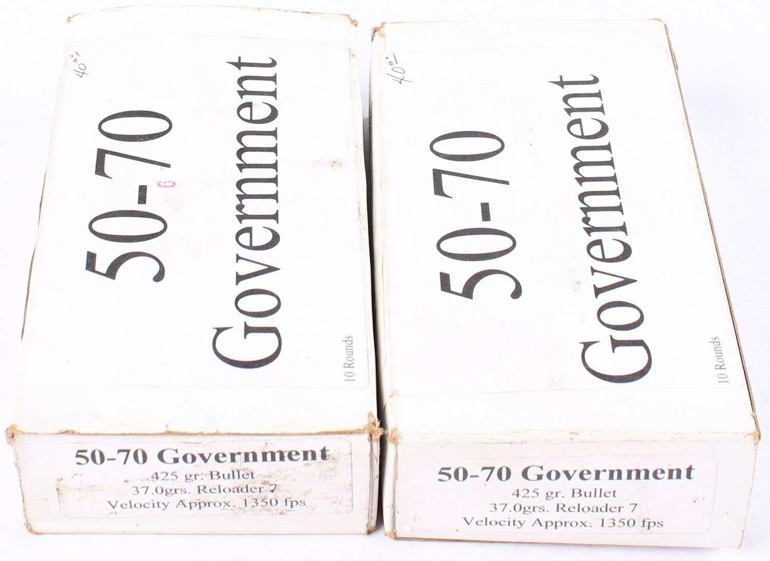 Unknown Mfg., Lot of (2), .50-70 Government, 425 Grain, Partial 20rds., 1pc, white boxes are solid, ammo is good. Grade: Good ++ - Value: 20 to 40