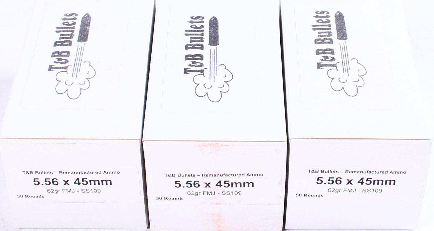 T&B Bullets, Lot of (3), 5.56 x 45mm ammo boxes, Remanufactured Ammo by a class type 7 Ammo MFG (this is the same class (high quality) as Winchester, Federal and or CCI), 62 Grain FMJ - SS109 bullet, loaded cartridges, 1pc, Full 50 count boxes, white boxes are very solid, ammo is minty. Grade: Excellent ++ - Value: 20 to 80