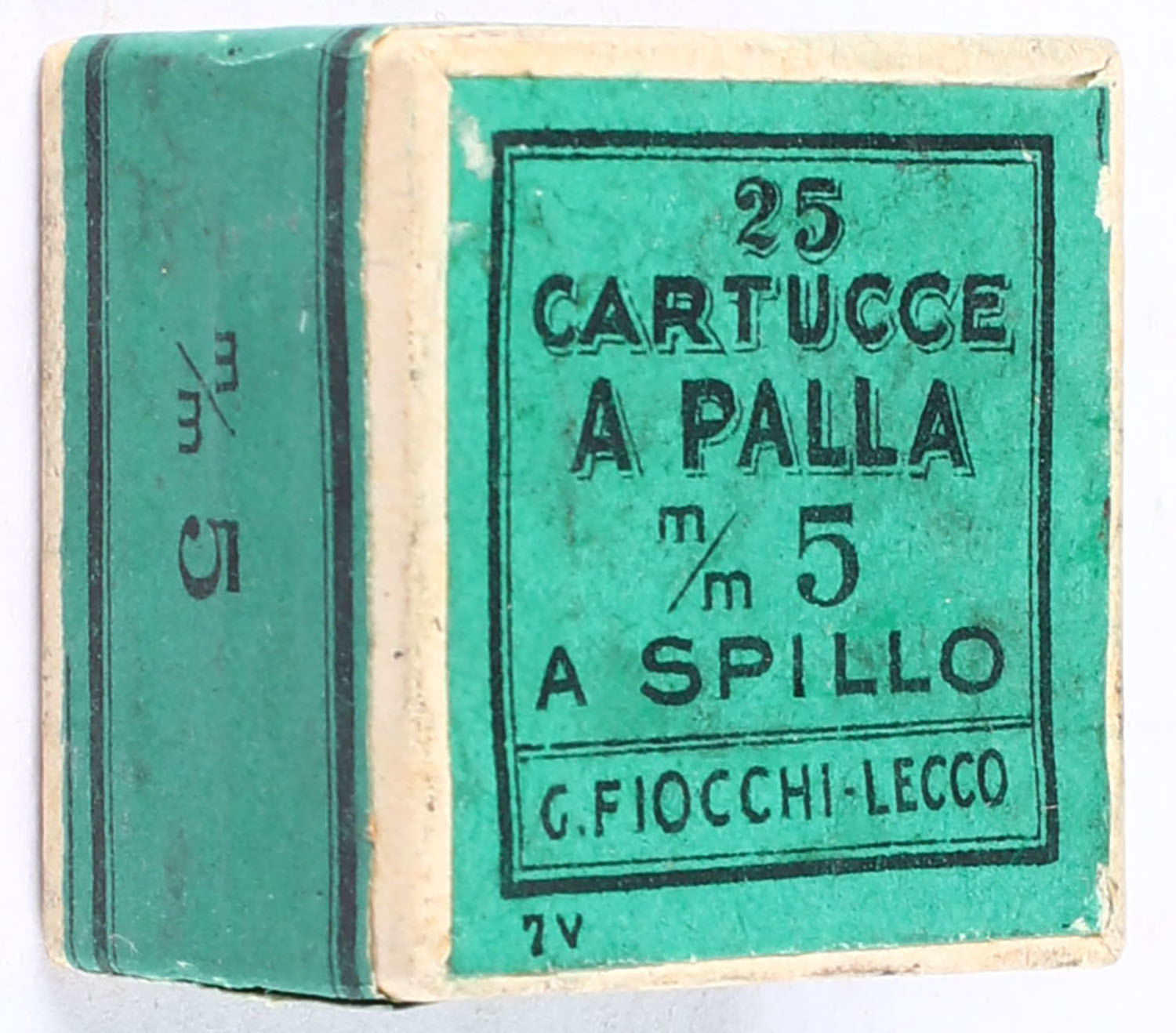 Fiocchi, Cartucce A Palla, 5mm Pinfire, FULL & SEALED, 2pc, buff box with green top & side sealing labels, box is solid with excellent color, very minor age soiling, corners are mostly sharp, edges are crisp, labels are intact. Grade: Excellent ++ - Value: 100 to 300
