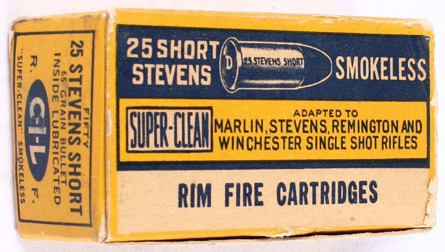 CIL, Super Clean, .25 Stevens Short, Rim Fire, 65 Gr. Bullet, 1pc, Full, yellow box with blue label & blue print, box is solid with light rub wear, has a partial seam split, ammo is Excellent. Grade: Very Good - Value: 20 to 80