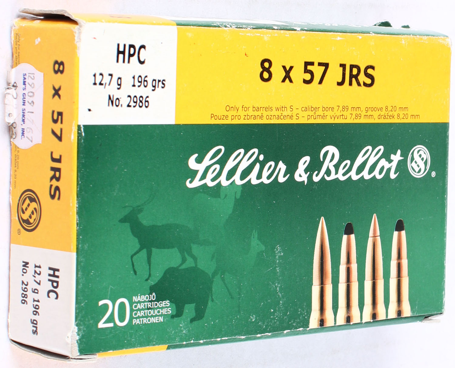 Sellier & Bellot, 8 x57 JRS, FULL, 1pc., Box is solid with light corner wear, ammo is mint. Grade: Very Good - Value: 20 to 30