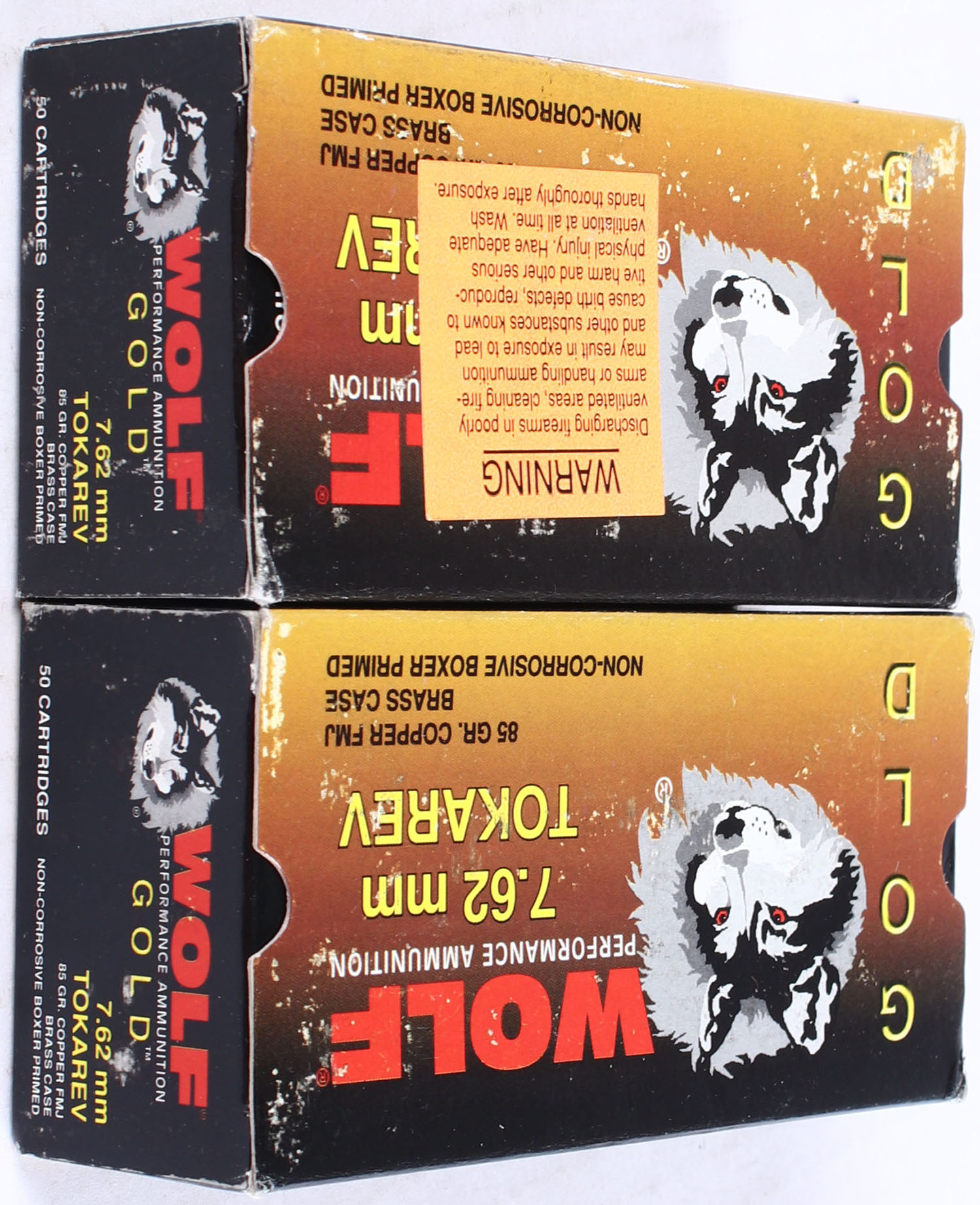 Wolf, Lot of (2), 7.62mm Tokarev, 85 Grain Copper FMJ, Brass Case, Full, 1pc, multi-colored box, box is very solid, ammo is excellent. Grade: Excellent - Value: 30 to 45