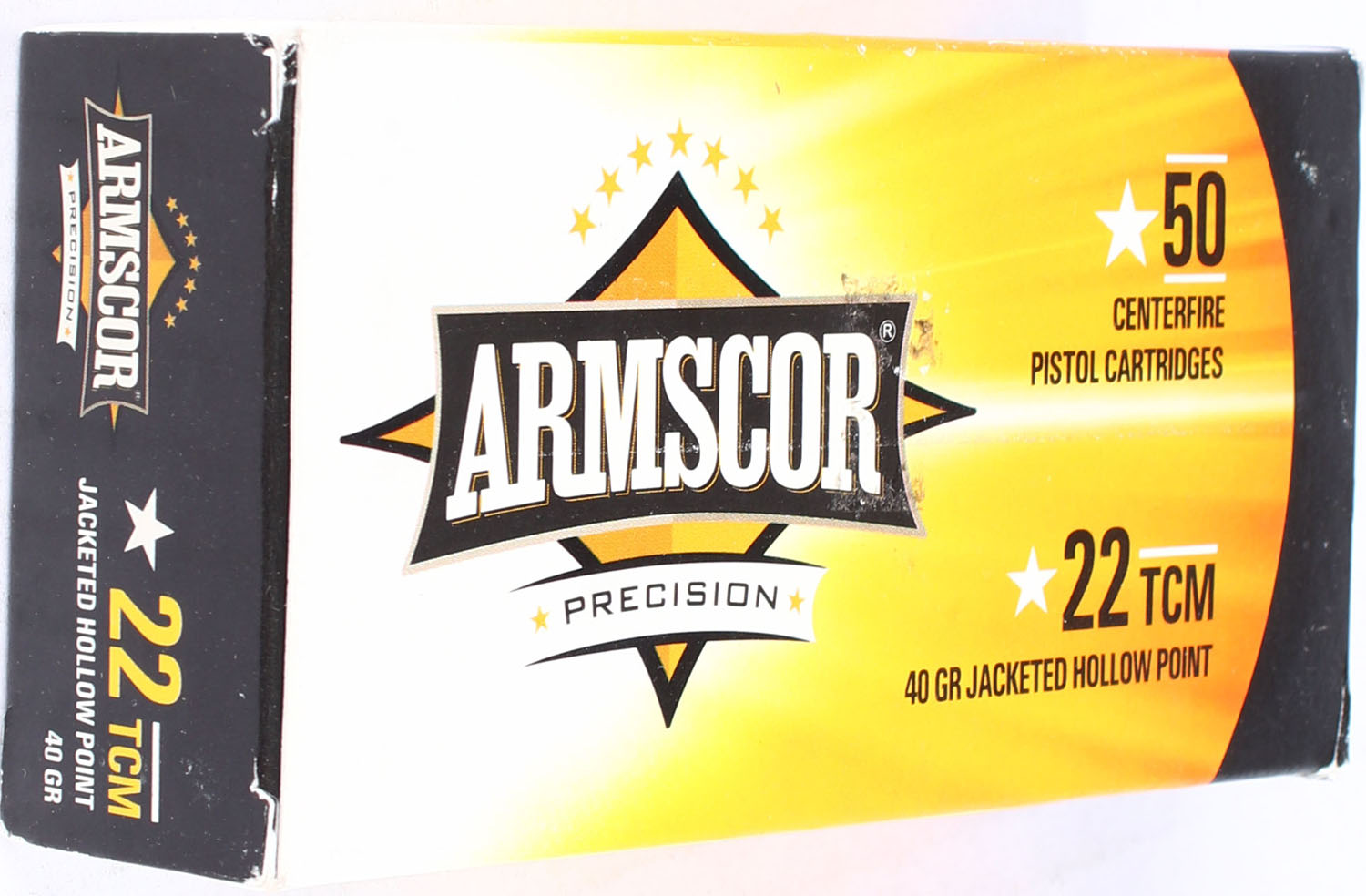 Armscor, 22 TCM, 40 Grain JHP, Full, 1pc, Box is very solid, ammo is excellent. Grade: Excellent + - Value: 10 to 20