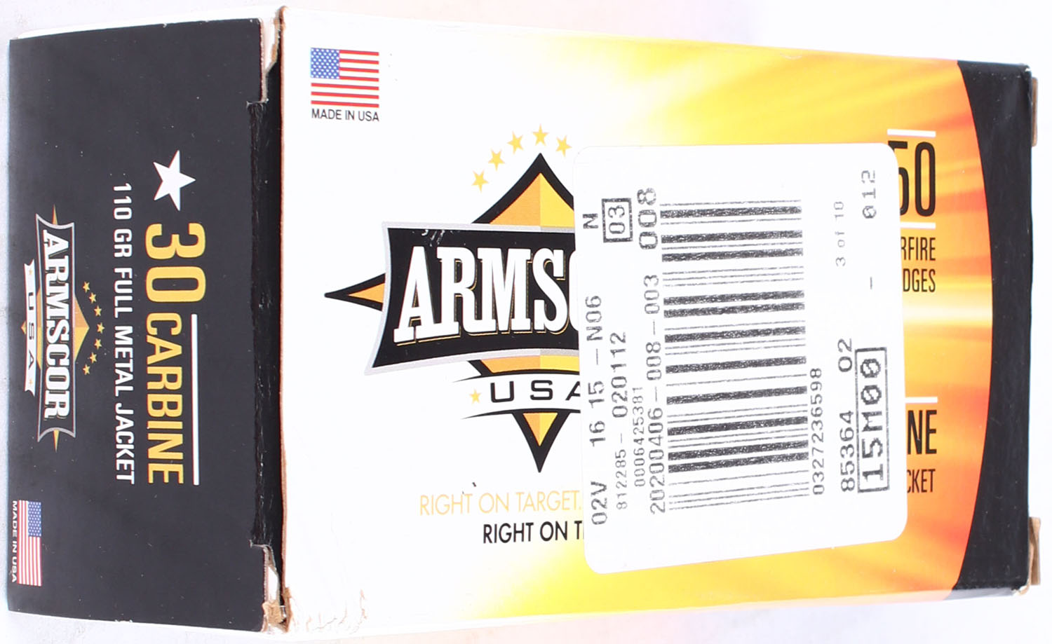 Armscor, .30 Carbine, 110 Grain FMJ, Full, 1pc., box is very solid with minty color, ammo is minty. Grade: Excellent + - Value: 20 to 30