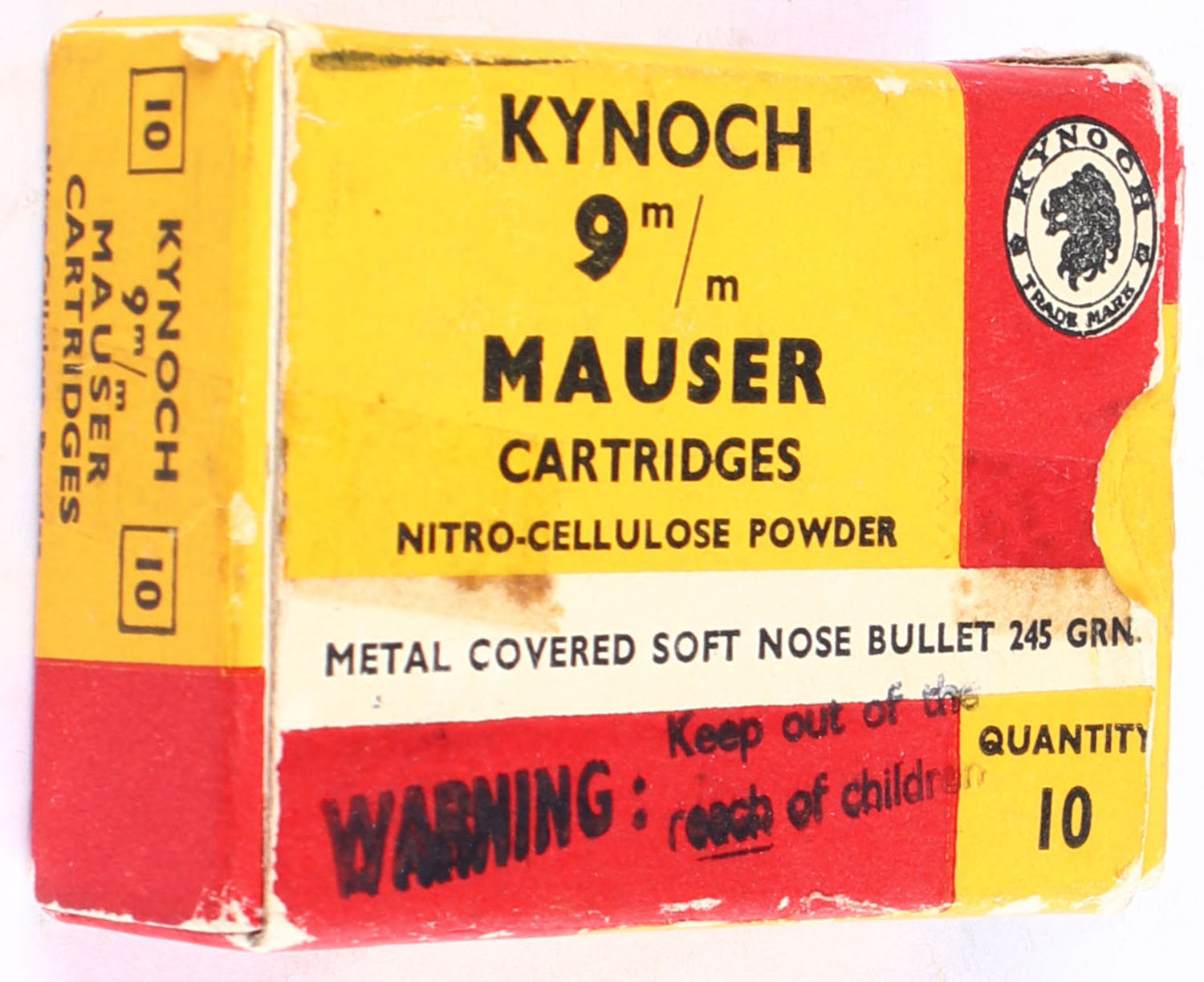Kynoch, 9 m/m, 245 Grains, Full, 1pc. Multi-colored box, box has age soiling, Ammo is excellent. Grade: Excellent - Value: 16 to 24