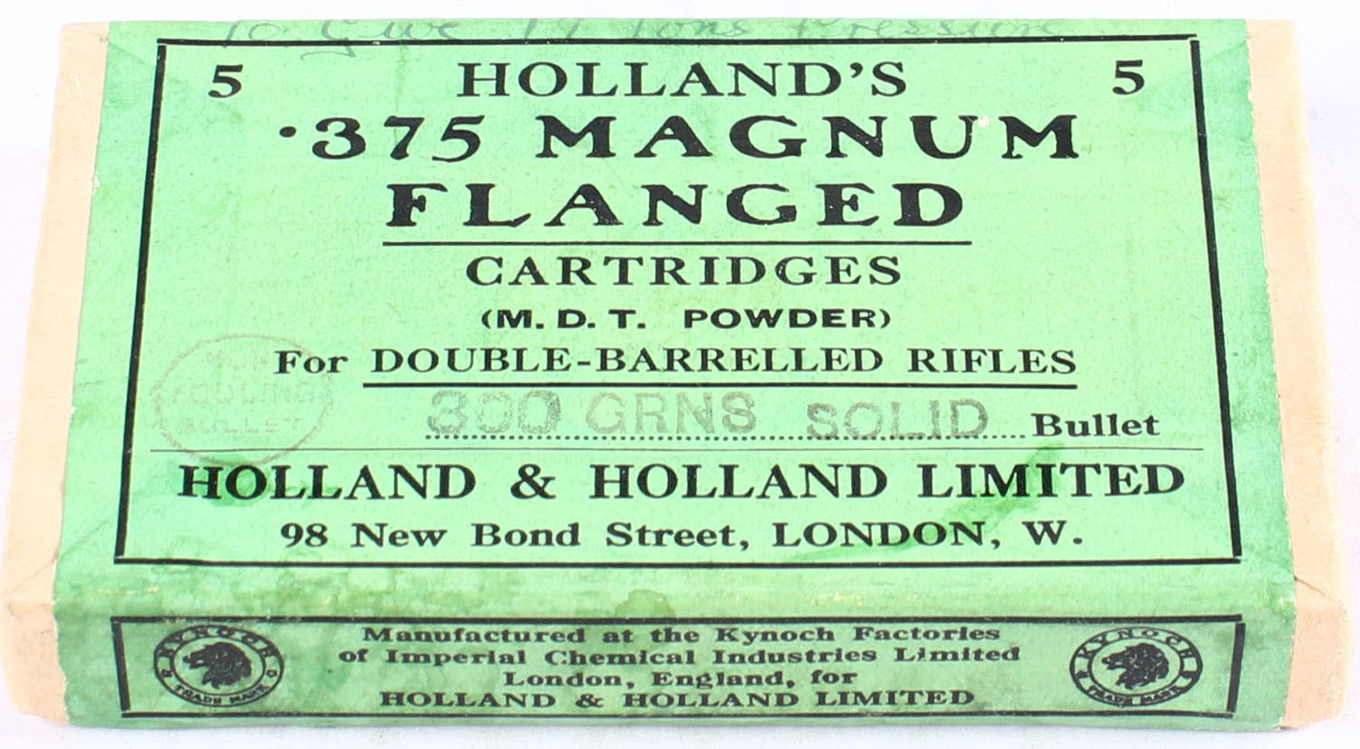 Holland's, .375 Magnum Flanged, 300 Grain, FULL & SEALED, 2pc., Buff box with green & black label, box is solid with excellent color. Grade: Excellent - Value: 20 to 100