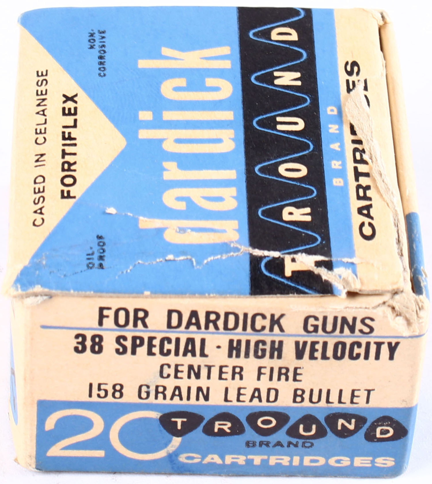 Tround, Dardick, 38 Special, 158 Grain, Full, 1pc, multi-colored box, box has a partial tear to front, ammo is excellent. Grade: Very Good - Value: 60 to 90