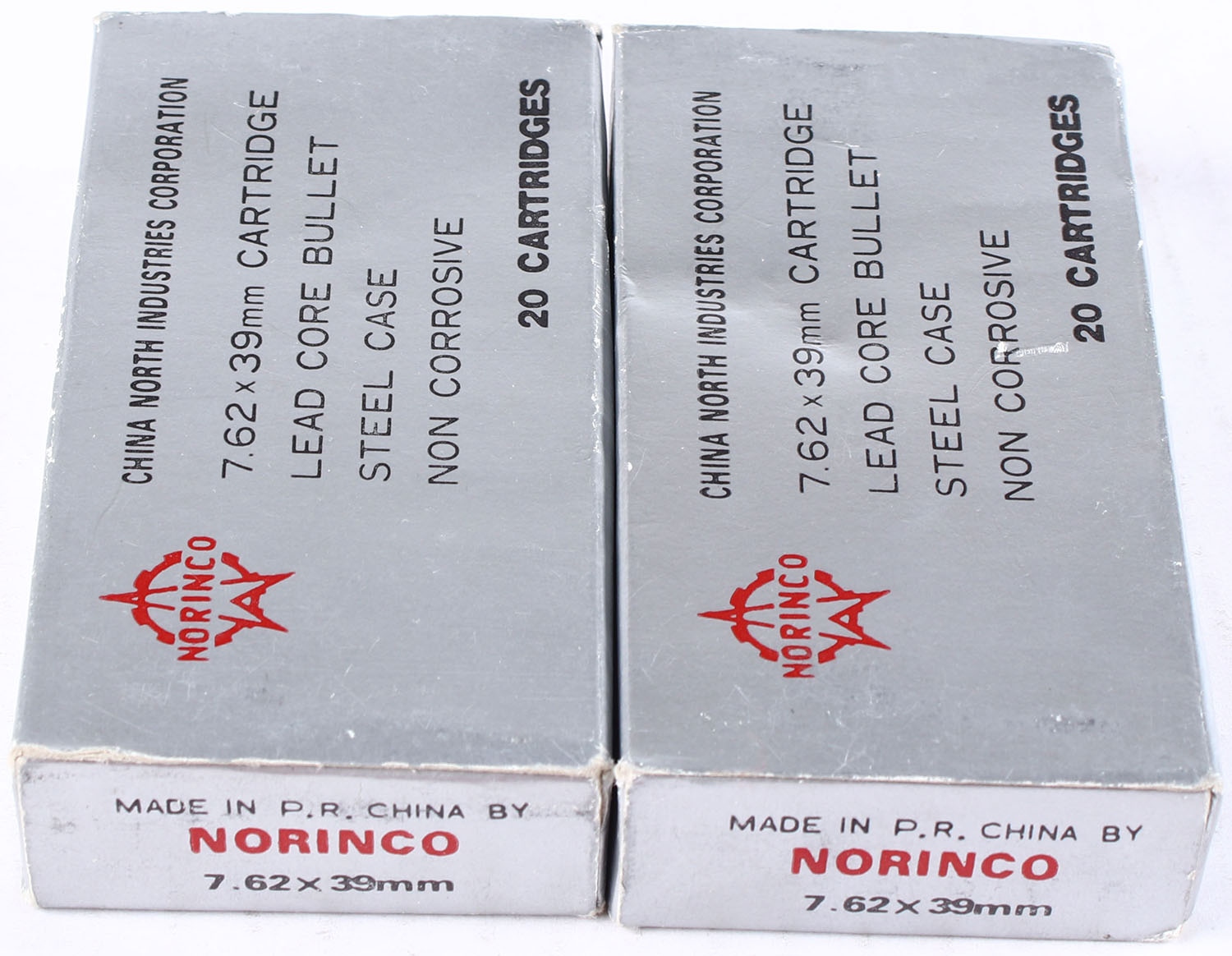 Norinco, Lot of (2), 7.62 x 39mm, Full, Lead Core Bullet, 1pc., Silver boxes have light age soiling with corner wear, ammo is excellent. Grade: Very Good - Value: 10 to 20