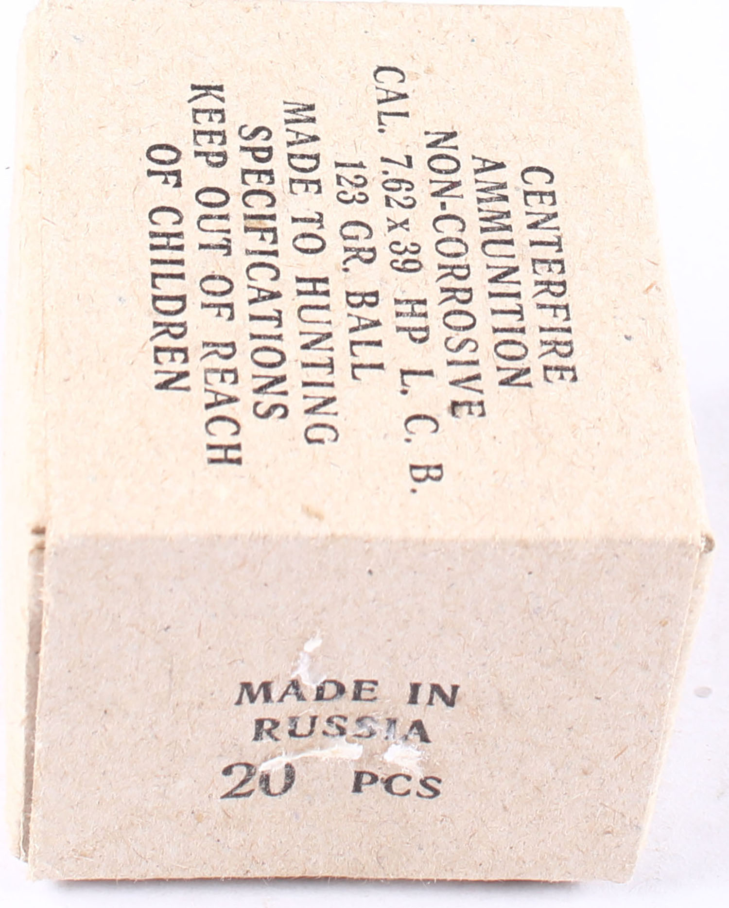 Unknown Russian Mfg., Lot of (6), 7.62x39 HP, 123 Grain Ball, Full & Partially Sealed, 1pc, buff boxes with black print, boxes come in a ''Brick'', brick is very solid. Grade: Excellent ++ - Value: 40 to 60