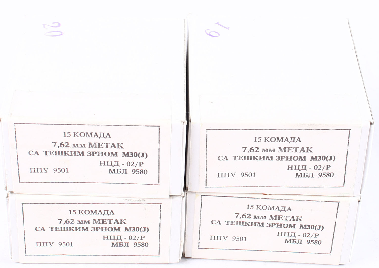 Unknown Mfg., Lot of (4), 7.62mm, Full, 1pc., White boxes with black & white label, boxes are very solid, ammo is excellent. Grade: Excellent - Value: 24 to 36