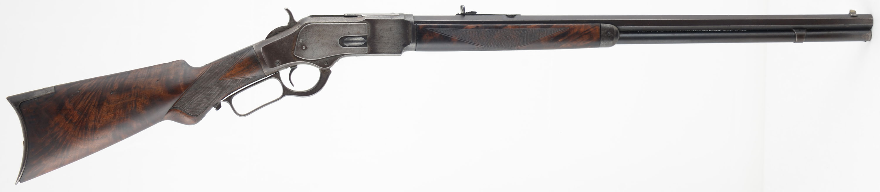 FANTASTIC Winchester Model 1873 Deluxe, 38 WCF CAL., MFG: 1895, SN: 496970, Lever Action Rifle, 24 1/4'' Octagon barrel, Full Mag. The factory deluxe, checkered, flat pistol grip wood stocks are excellent. Having been cleaned, lightly sanded & reoiled. The stocks have a few light scratches & contusions remaining & there is a 1'' grain stress crack in the middle of the right side of the forend. There is some missing edge chipping at the toe. The stocks have fantastic feathered & rippled contrasting grain. The pistol grip displays an ebony insert. The metal blue finish on the barrel & mag have toned mostly to a brown patina, with remnants of original blue in protected areas between barrel & mag. The case-hammered receiver, lever & hammer have some smokey outlines of faded case-colors, but have mostly faded or worn gun metal gray, with a thin brown patina. Bore is good, but with cleaned roughness amongst solid rifling. The barrel holds an adjustable rear & silver pinched blade front sights. Buttstock carries a sliding trapdoor crescent metal buttplate. Plain trigger. A beautiful, deluxe 1873 rifle which presents well. Antique, NO FFL Req. - Value: 5000 to 6500