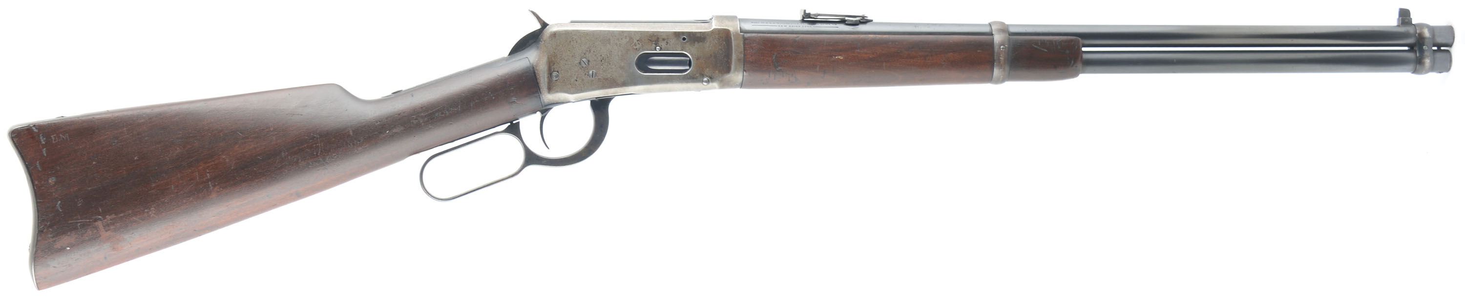 Winchester, Model 94 Carbine, CAL: 30 WCF (30-30), MFG: 1929, SN: 1054731, Lever Action Carbine, 20'' Round Nickel Steel barrel, Full mag. The straight grip wood stocks are excellent, with several minor handling marks, scratches & contusions to the excellent original finish, which is thinning some on the belly of both the stock & forend. There is a couple of lightly scratched initials on the right back corner of the stock near the buttplate. The original metal blue finish rates 85% on the barrel & mag, while the receiver has worn gun metal gray on the right side, while the left side retains 50% blue. The hammer, lever, bolt & loading gate all retain the majority of original blue. Bore is excellent & bright. Fitted with a carbine ladder rear sight & carbine box front sight. Buttstock carries a smooth carbine metal buttplate. Smooth tight action. Overall, very nice & original carbine in a popular hunter's category. FFL or C&R Req. - Value: 1200 to 2000