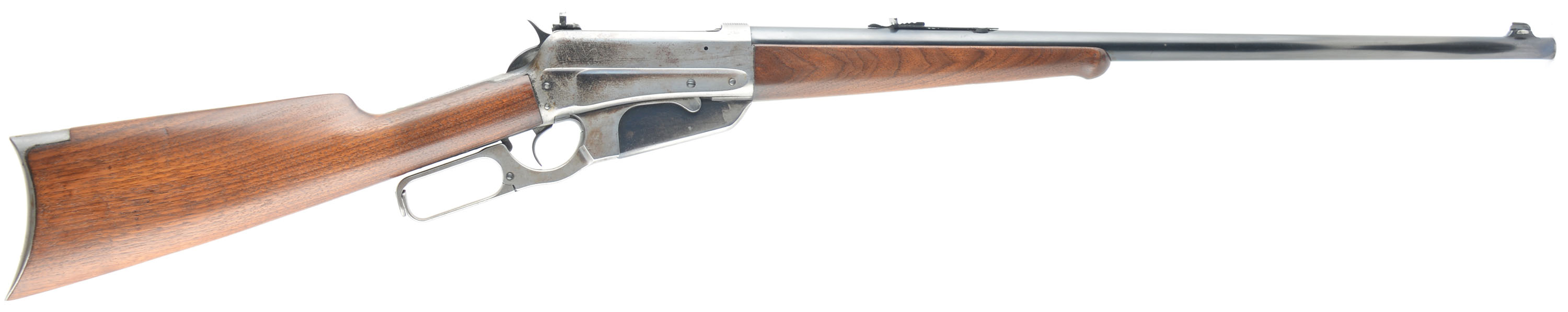 Winchester Model 95, CAL: 30 GOV'T-06, MFG: 1924, SN: 419851 Lever Action Rifle, 24'' round tapered barrel. The original straight grip wood stocks are excellent, as having been cleaned, possibly very lightly sanded, & excellently refinished. There are very few handling marks or minor contusions remaining. The factory metal blue finish rates 95% on the barrel, while the receiver has worn mostly gun metal gray, with protected areas displaying remnants of original blue. Bore is excellent. The rifle is fitted with a Climbing Lyman #21 receiver sight, while the barrel carries an adjustable rear sight & Marbles Sheard elongated blade front sight. Crescent metal buttplate. Tight smooth action. The rifle presents very well. FFL or C&R - Value: 2000 to 2750