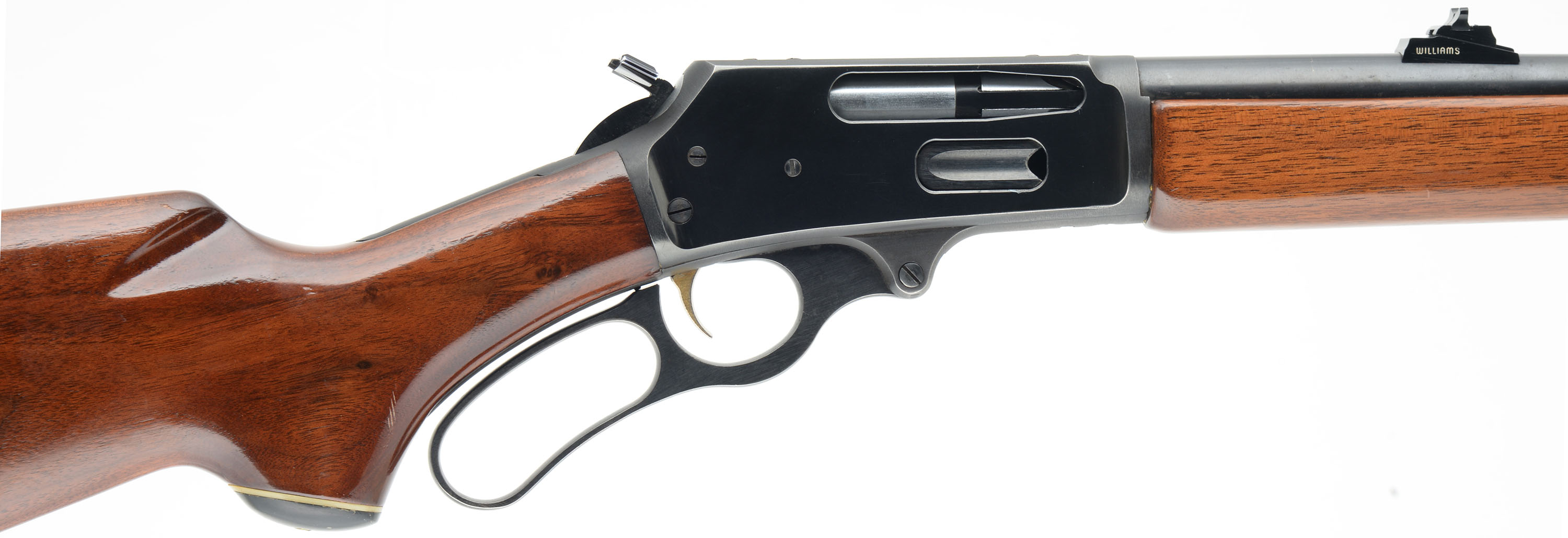Marlin, Model 336 A, CAL: 30-30 WIN, MFG: 1975, SN: 25023580, Lever Action Rifle, 23 3/4'' barrel, 2/3rds mag. The original whiteline capped pistol grip wood stocks are excellent, as previously lightly sanded & refinished. There are very few minor handling marks remaining to the high gloss refinish. The metal blue finish rates 90% overall. Bore is excellent, & bright. The barrel carries a Williams slide adjusting rear & ramp elevated blade front sights. Receiver is factory tapped & drilled for potential scope mounts. Stock carries an Old English solid recoil pad. Factory trademark bullseye in belly of the stock. Sling studs. Added hammer extender. Gold tone trigger. A very nice presenting lever action hunting rifle. FFL or C&R Req. - Value: 500 to 1000