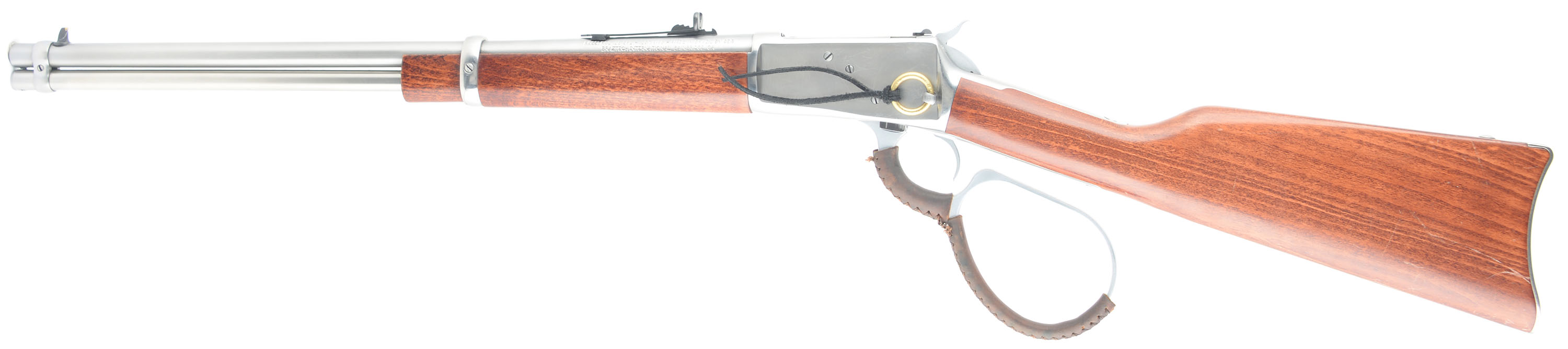 Rossi, Model R92 ''Big Loop'' Saddle Ring Carbine, CAL: 38 SPL - .357 MAG, MFG: Modern, SN: 7CR055200P, Lever Action Carbine, 20'' Stainless steel barrel. 1:24'' twist rate. Full Mag. The original straight grip stocks are excellent, with a few minor rubs & scratches to the excellent original finish. The stainless steel metal finish rates excellent overall. Bore is excellent. Barrel carries factory sights. Buttstock carries a carbine style buttplate. Leather wrapped lever & leather lash on the saddle ring. An excellent modernized version of an American classic. FFL Req. - Value: 600 to 1000