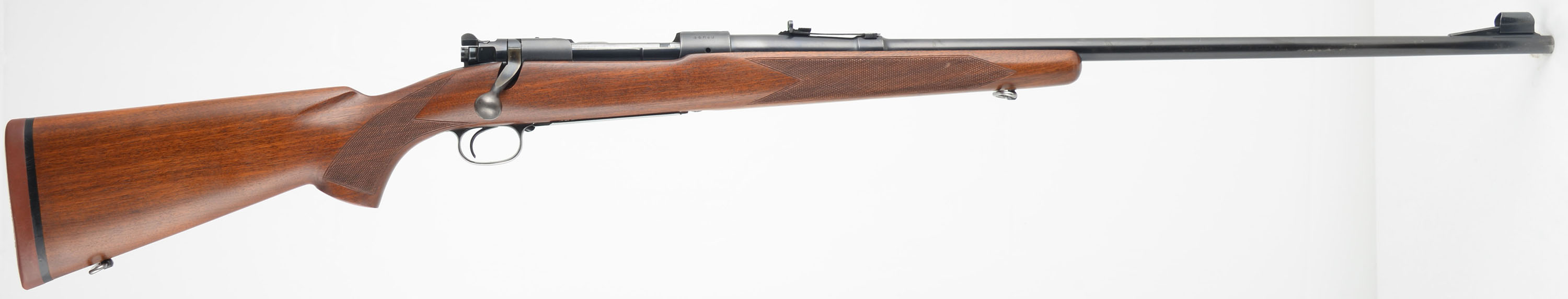 Winchester, Model 70, CAL: marked 300 MAGNUM IMP, MFG. 1942, SN: 446495, 26'' Round barrel. The barrel has the factory ''300 Magnum'' stamped on the left side, with the letter ''IMP'' stamped below it, indicating it has been rechambered to 300 MAGNUM IMP. The wood appears to have been professionally refinished, likely at the time of the caliber upgrade. The factory checkered & flat pistol grip wood stock is excellent, as lightly sanded & very nicely refinished. There appears to be a small inlay repair below the factory receiver sight provisions screws in the stock that is very well blended. The checkering appears to have been freshened as points are fairly sharp. There are very few minor rubs, light scratches or contusions remaining. Overall appearance of the stock & finish is excellent. The original metal blue finish rates 80% on barrel & receiver, while the trigger guard & floorplate shows additional wear. Bore is excellent. The receiver carries 4 scope mounting screw filled holes, two in the front of the receiver & two in the rear. The barrel has an adjustable rear sight & ramp & hooded front sight. The stock carries a Winchester solid recoil pad. Sling loops. Matching SN found on bolt. A sharp looking early WWII era vintage hunting rifle. FFL or C&R Req. - Value: 800 to 1500