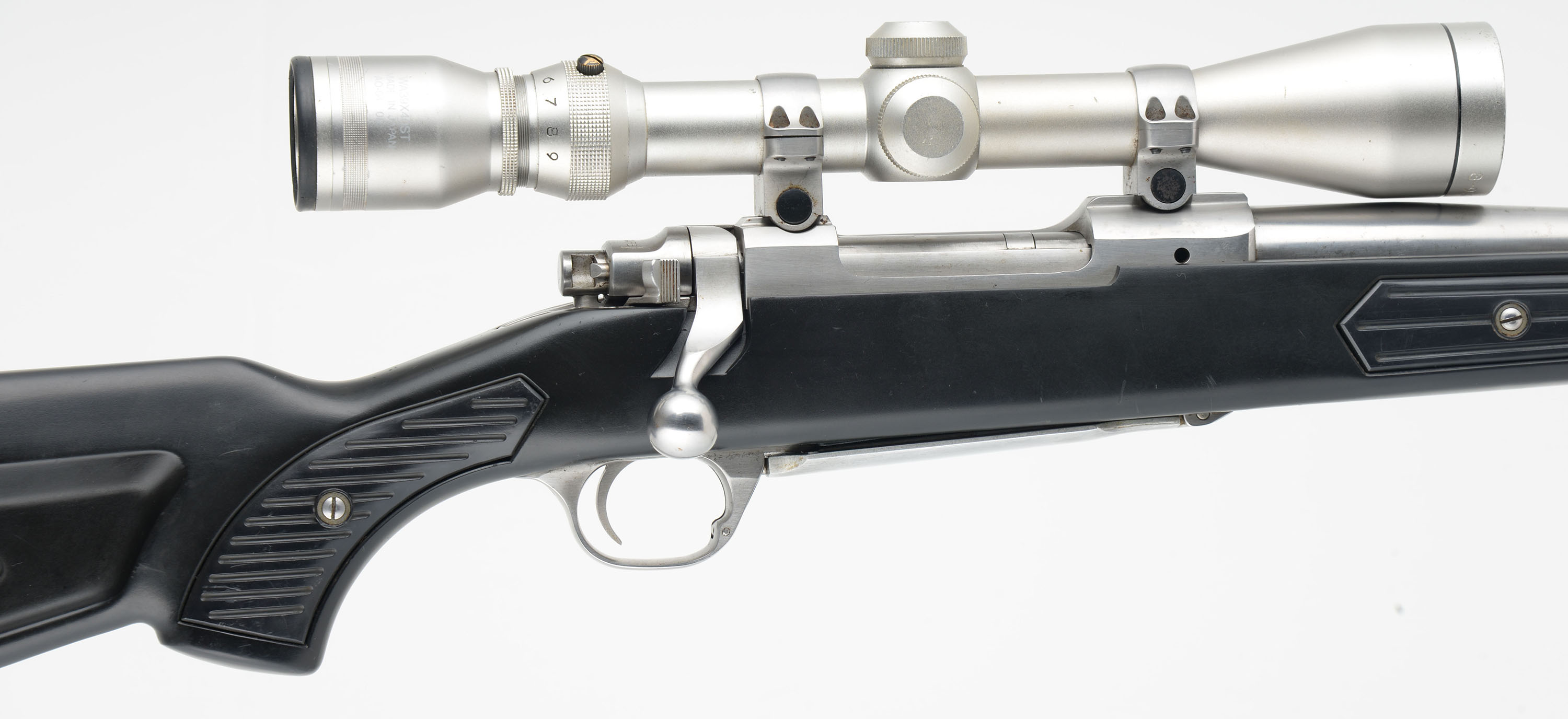 Ruger, Model M77 MARK II, Stainless All Weather, .223 Cal., MFG. 1993, SN: 781-42094, Bolt Action Rifle, 22'' round barrel, The factory Zytel synthetic stock (sometimes referred to as a skeleton or boat/canoe paddle stock) is excellent, but with several minor rubs, mainly located on the right side upper comb by the buttend. The stainless steel surfaces has a satin silver finish, which is excellent, with some fine brush lines & additional rub wear on the floorplate. Bore is excellent. The grooved receiver is fitted with a satin silver matching Tasco 3-9X40 scope, while the barrel has no sight provisions. Factory recoil pad & sling loops, A high quality, all weather, bolt action sporting rifle. FFL Req. - Value: 1000 to 1500