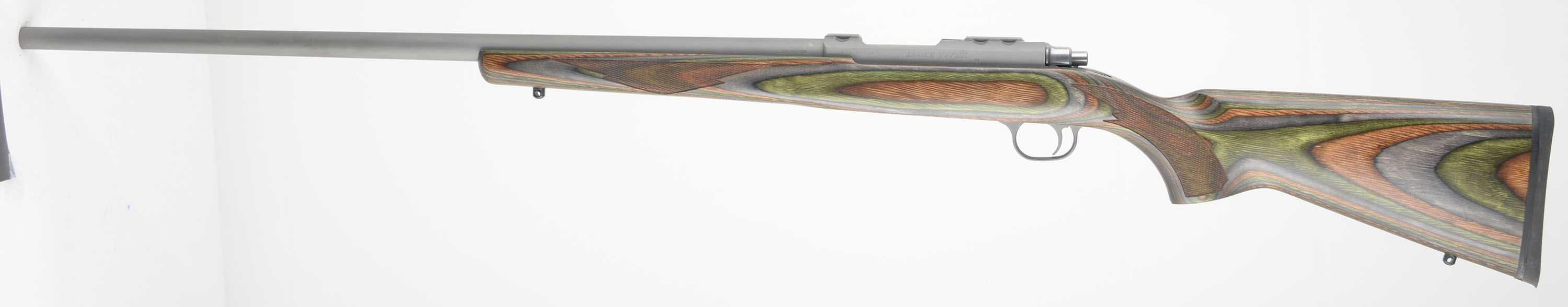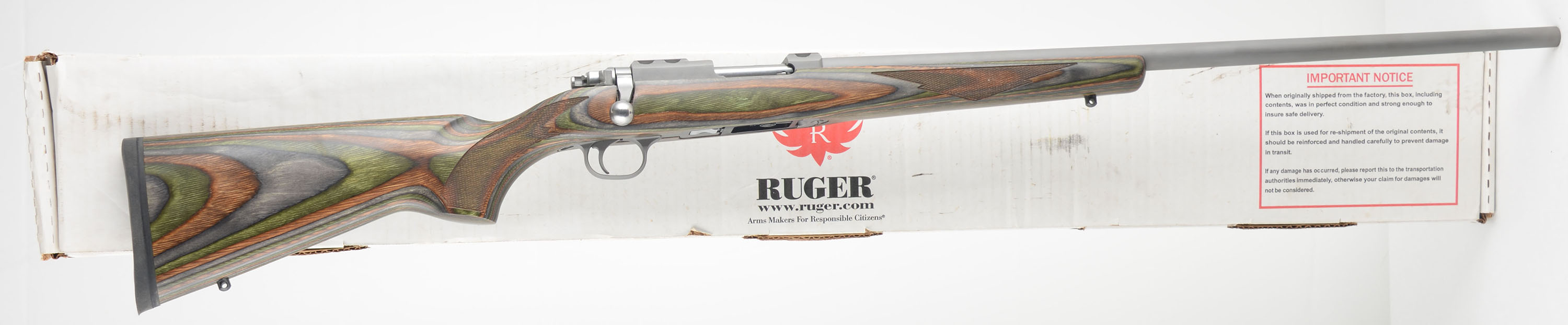 BOXED Ruger, Model 77/22, CAL: 22 Hornet, Stainless Target Grey, MFG: Modern, SN: 720-90720, Bolt Action Rifle, 24'' barrel. The original checkered & flat pistol grip laminated wood stock is excellent, with virtually no handling marks to the excellent original finish. Sharp checkering. The metal finish is a satin stainless gray & rates 99% overall. Bore is excellent. The receiver has integral scope mounts machined directly into the receiver, & comes with the factory scope mount rings for future scope mounting. No provision for open sights on the barrel. Buttstock carries a Ruger logo solid black rubber recoil pad. Sling studs. Factory detachable mag. This rifle comes from a closed gun shop where it was backstock inventory. It does not appear that the scope mounts were mounted or that it was shot, however it does have a couple of minor handling rubs on the barrel from in store handling. Basically, near new old stock, which comes in the original box, with factory paperwork, finish matching scope rings, & lock. MSRP is $1349. Excellent overall. FFL Req. - Value: 1000 to 1300
