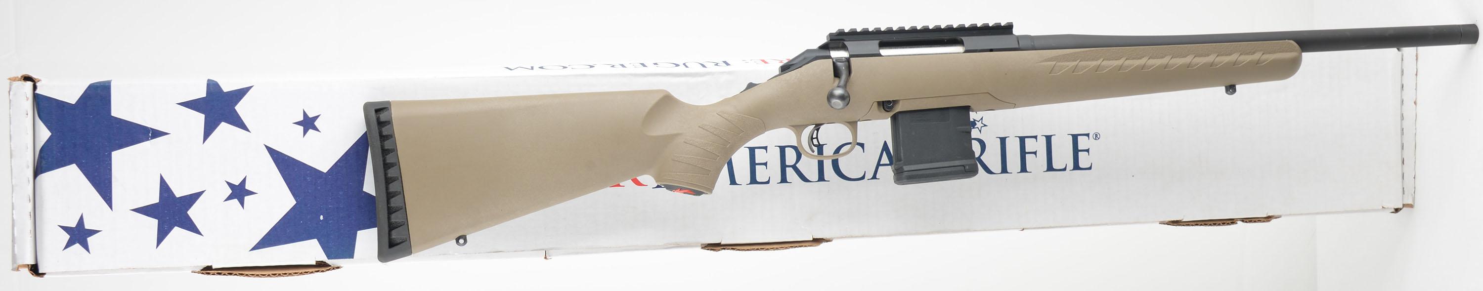BOXED Ruger Model ''American'' Ranch FDE, CAL: .5.56 NATO, MFG: Modern, SN: 690316921, Bolt Action Rifle, 16 1/8'' Hammer-forged tapered barrel, with capped threaded muzzle tip for possible brake or silencer mounting. The original capped pistol grip, flat dark earth composite stock is excellent. The original matte black metal finishes are 99%+ overall. Bore is excellent. The receiver carries a picatinny rail, while the barrel carries no open sight provisions. Ruger Marksman adjustable trigger. Tang Safety. Black rubber recoil pad, LOP 13.75'' over pad. Ruger detachable extended mag. Swing studs. Comes in the original factory box, with packaging, paperwork & lock. Near new, excellent overall carbine length rifle. FFL Req. - Value: 400 to 600