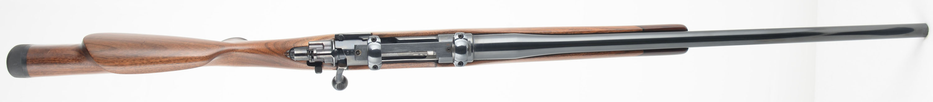 Custom DWM, Model: 1909 Argentino Mauser Action, Cal: 240 Weatherby, MFG: 1910 German, S/N: B3773, Bolt action Rifle, 22 1/2'' barrel. The custom cheeked & flat pistol grip Monte Carlo stock is excellent, with the rosewood slant cut forend tip & pistol grip cap. Its features give the custom stock has the appearance of a Weatherby style stock. The deluxe wood displays excellent grain & has very few tiny handling marks to the excellent overall finish. The metal blue finish rates 95% overall, with some cleaned pitting under the blue on the floorplate. The left side of receiver is marked ''MAUSER MODELO ARGENTINO 1909'', ''DEUTSCHE WAFFEN-UND'', ''MUNITIONSFABRIKEN BERLIN'', right side of receiver is marked with S/N, Left side of the barrel is stamped ''M. Robinson''. Bore is excellent & bright. The receiver carries a set of rings on a Redfield bar mount, while the custom barrel carries no open sight provisions. The stock carries a Decelerator solid rubber recoil pad. Excellent overall & nicely built. FFL or C&R Req. - Value: 400 to 800