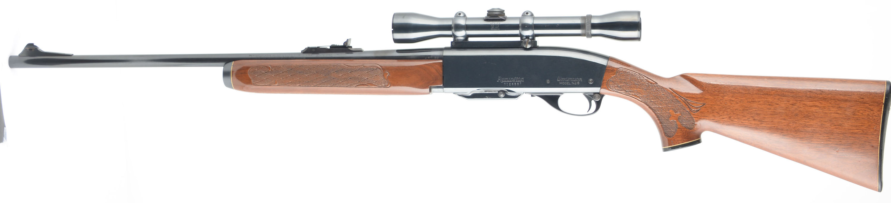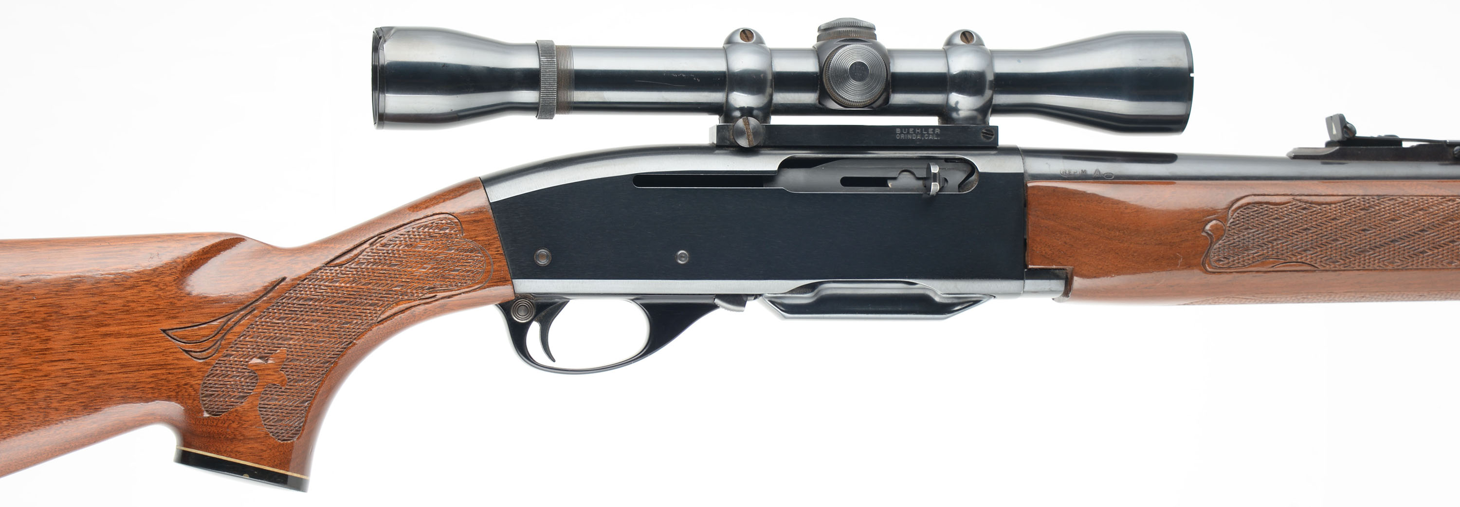 Remington, Model 742 Woodsmaster, CAL: 30-06 SPRG, MFG: 1971, SN: 7128667, Semi Auto Rifle, 22'' barrel. The original checkered & capped pistol grip walnut stocks are excellent. There are a few minor handling marks or light scratches to the excellent original finish. The original metal blue finish rates 97% overall. Bore is excellent. The receiver carries a Weaver K4-C3 scope mounted Buehler mounts, while the barrel holds factory sights. There is a dent in the top of the lip of the back portion of the scope above the lense. Does not affect functionality of scope. The stock caries the factory buttplate.. Detachable mag. Overall excellent & original condition. FFL & C&R Req. - Value: 500 to 1000