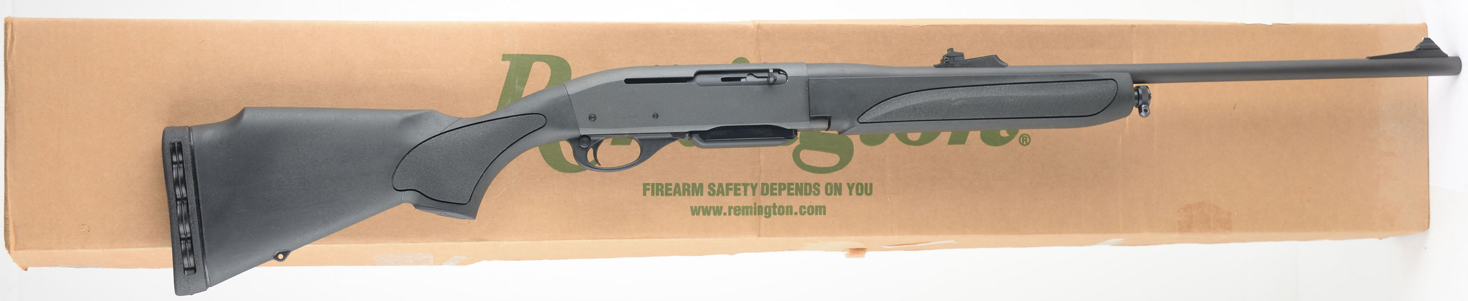 BOXED Remington, Model 750 Woodsmaster, CAL: 308 WIN, MFG: Modern, SN: D8016992, Semi Auto Rifle, 22 1/2'' barrel. The original flat pistol grip, black synthetic stocks are excellent, with textured grip panels. The original matte metal finish rates 100% overall. Bore is excellent. The barrel holds factory sights. Stock carries a Limb Saver rubber recoil pad. Comes in the original box, with a second detachable mag, still sealed in packaging, trigger lock & paperwork. Sling provisions. Overall excellent & original condition, FFL Req. - Value: 500 to 1000