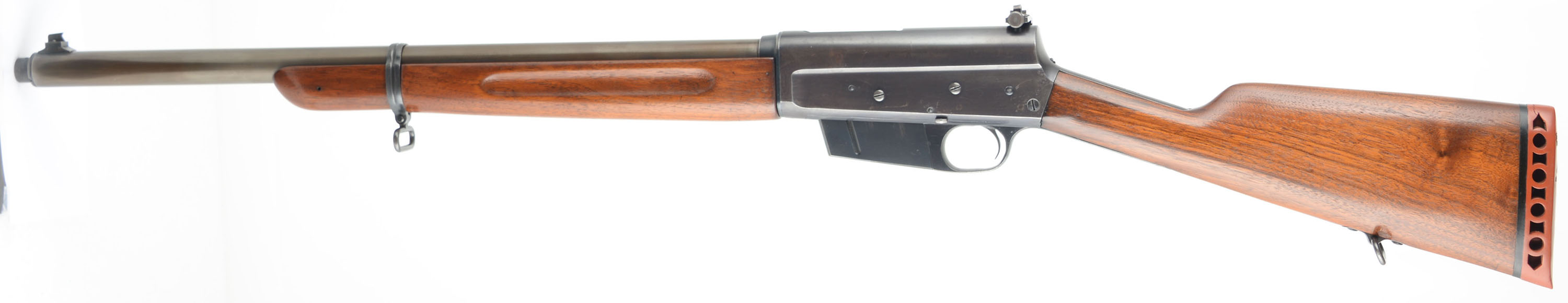 EXTREMELY RARE Remington, Model 8, TRIALS RIFLE, .25 Rem Cal, MFG. 1920, SN: 45616, Semi-Auto Rifle, 22'' barrel. This isn't just any Model 8, this one of the very Rare U.S. Trials models! In 1921, the Army Infantry School at Fort Benning received 25 Model 8 rifles chambered for .25 Remington. Warfare was evolving at the time, & the U.S. needed rifles to test the viability of a semi-automatic platform. While the model 8 was not developed nor intended for actual combat, these rifles were upgraded for testing & the development of tactics & military doctrine of a semi-auto rifle. The rifles were upgraded in collaboration with Springfield Armory with upgraded sights & a lengthened military style grooved forend with sling swivels. The barrels were provided without rear sight provisions, as the rear sight was to be the Lyman 48 aperture peep sight. The book ''The Great Model 8'' by John Henwood lists the serial range for these rifles as 42200 to 45737 for known examples. This one falls within the later portion of that range. The original straight grip stock & forend are excellent, with both appearing to have been lightly sanded & nicely finished. There remain very few tiny handling or wear marks, with the exception of one larger scrape/contusion just above the sling loop on the right side of the stock. The original metal blue finish on the receiver rates 70%, toning a bit plum as it thins. The finish on the barrel has evenly wore or simply faded to a thin brown patina. Bores on any Model 8 rifle in 25 caliber are rarely great for whatever reason, however the bore on this rifle maintains an excellent bore. The rifle carries the correct Lyman 48 aperture peep sight & the special customized tall blade front sight mounted on a raised base. The buttstock carries a vintage Red Duck ventilated recoil pad, which required a small wood inlay into the toe to fill the void where the lower tang would have been on the original crescent metal buttplate. The stocks carry the original sling loops which are unique to the trials rifle. 5 round fixed magazine. Tight action. This is a rare opportunity to purchase the rarest variation of the Remington 8 & 81 family, & the Holy Grail to enhance any Remington collection.* FFL or C&R Req. - Value: 10000 to 15000