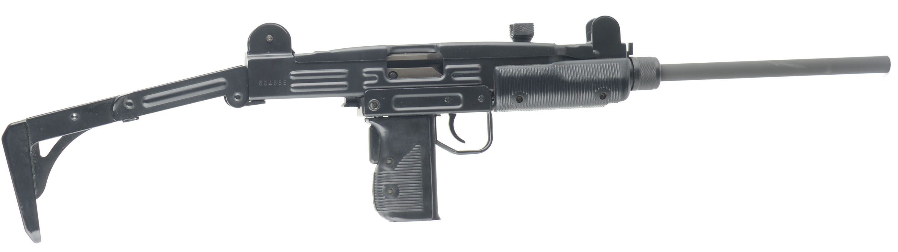 CONDITION: The grooved black polymer pistol grip & foregrip are excellent with a couple minor scuffs & light handling wear. Metal folding buttstock. The parkerized finish on the barrel rates 98% with a minor scuff. The black paint finish on the rest of the metal rates 97% with a few light scratches. The left side of the receiver is marked ''VECTOR ARMS. NSL. UT'', the rear left side of the receiver is marked ''HR4332S'', ''9mm/45 ACP/ 22'', ''GROUP IND'' in their logo, ''LOU KY 40214''. The right rear side of the receiver is marked with the S/N. The bore is excellent. The receiver holds a adjustable post front sight with protective ears, & a non-adjustable, aperture flip up L sight with 100 & 200 meter positions. The folding buttstock has carries no buttplate, but the shoulder end is grooved for better control. The gun appears to be in full working mechanical order. Comes with a 3'' dummy/display barrel, it is solid all the way through & is basically a barrel blank. It does mount to the gun, but it will not function with the firearm & is only for display purposes. Does not come with a mag. FFL Req - Value: 1200 to 2400