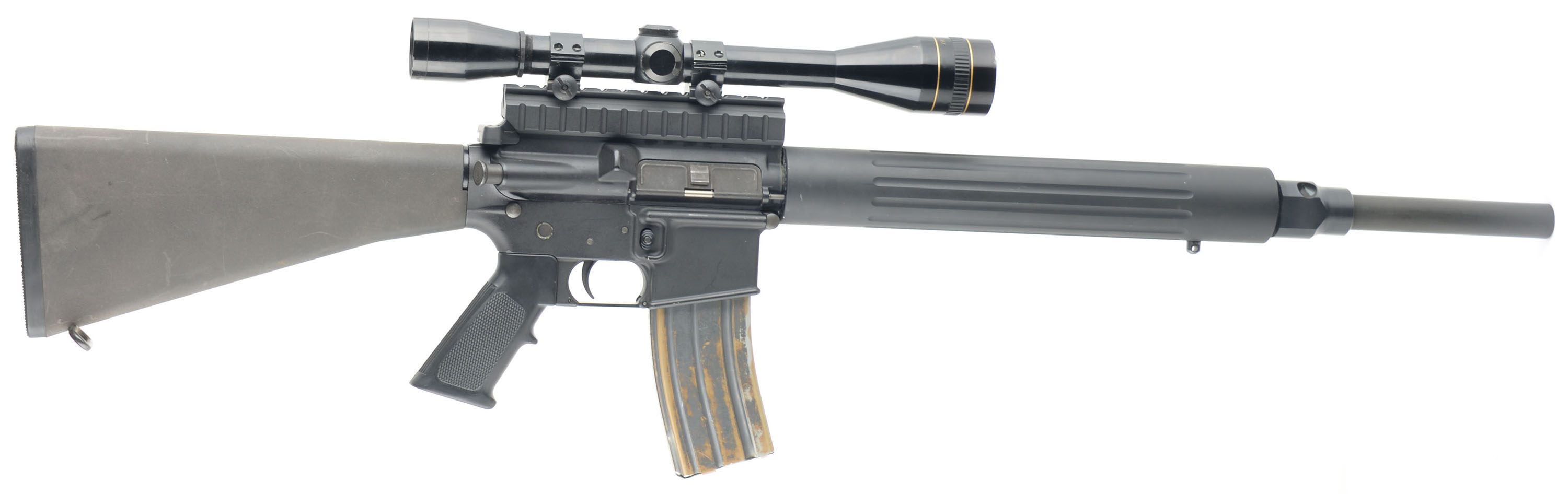 DPMS, A-15, CAL: .223/5.56 (barrel marked .223), MFG: Modern, SN: 11117, Semi Auto Rifle, 20'' barrel. The synthetic checkered grip, composite stock & flued metal forend are all excellent, with handling marks & scuffs. The matte black finish on the upper, lower & barrel rates 95%. The finish on the receiver has a grainy texture & the metal blue finish on the barrel is smooth. Bore is excellent. The rifle is fitted with a Leupold Gold Ring 12x scope. No open sights. Sling loop & stud. Magazine is worn, with brown patina. FFL Req. - Value: 300 to 600