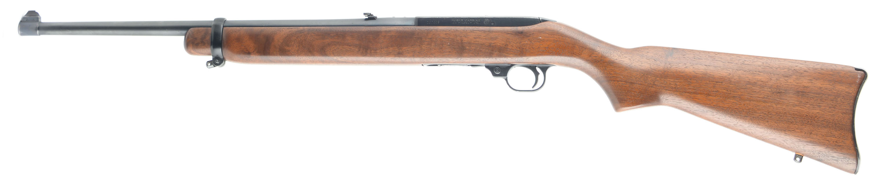 Ruger, Model 44 Carbine, CAL: 44 MAG, MFG: 1966. SN: 107009, Semi Auto Rifle, 18 1/2'' Barrel. The factory wood stock is in excellent condition, solid with light handling wear, scratches, and dings. The blued finish on the barrel and frame rates 97% with some splotches of patina and exposed gun metal grey. Bore is excellent, the rifling is bright and strong. Mechanically solid, seems to function well. The gun has a rear flip up sight and front post sight that are set in dovetail cuts on the barrel. FFL Req. - Value: 700 to 1400