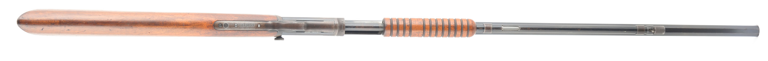 Winchester, Model 90, .22 LONG RIFLE Cal., MFG: 1932 SN: 844619, Slide Action Pump, 24'' Tapered octagon barrel. The L.R, only caliber is the rarest & most desired caliber amongst collectors as only 10% of total production was this caliber. The L.R. caliber was added in the 1890 line-up in 1919. The original wood is excellent, with a few minor finish level handling marks to the original finish. The original metal blued finish rates 85% on the barrel & mag, while the receiver has a thin brown patina & remnants of blue in the more protected areas. Bore is excellent. The receiver carries a Lyman flip-up tang sight, while the barrel carries the original adjustable rear sight & blade front sight, with white bead. Factory crescent steel buttplate, A very nice original example of a single caliber 90. FFL or C&R Req. - Value: 1500 to 2500