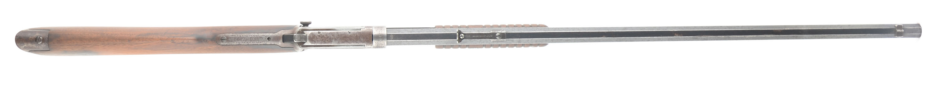 Winchester, Model 90, .22 LONG RIFLE Cal., MFG: 1912 SN: 501210, Slide Action Pump, 24'' Tapered octagon barrel. The L.R, only caliber is the rarest & most desired caliber amongst collectors as only 10% of total production was this caliber. The L.R. caliber was added in the 1890 line-up in 1919. The barrel on this rifle has a ''P'' proof stamping indicating it is a later replacement after the LR only caliber was added. The original wood stocks are very good, but were sanded long ago & then reoiled. There are some minor handling marks or contusions remaining, & some dark staining. The original metal blue finish rates 70% on the barrel, but with lots of speckling or cleaned pitting. The receiver & mag tube are gun metal gray, with a spotty has a thin brown patina, with spotty brown patina. Bore is excellent. The barrel carries the original adjustable rear sight & blade front sight. Factory crescent steel buttplate. Likely a great pump rifle shooter. FFL or C&R Req. - Value: 400 to 800