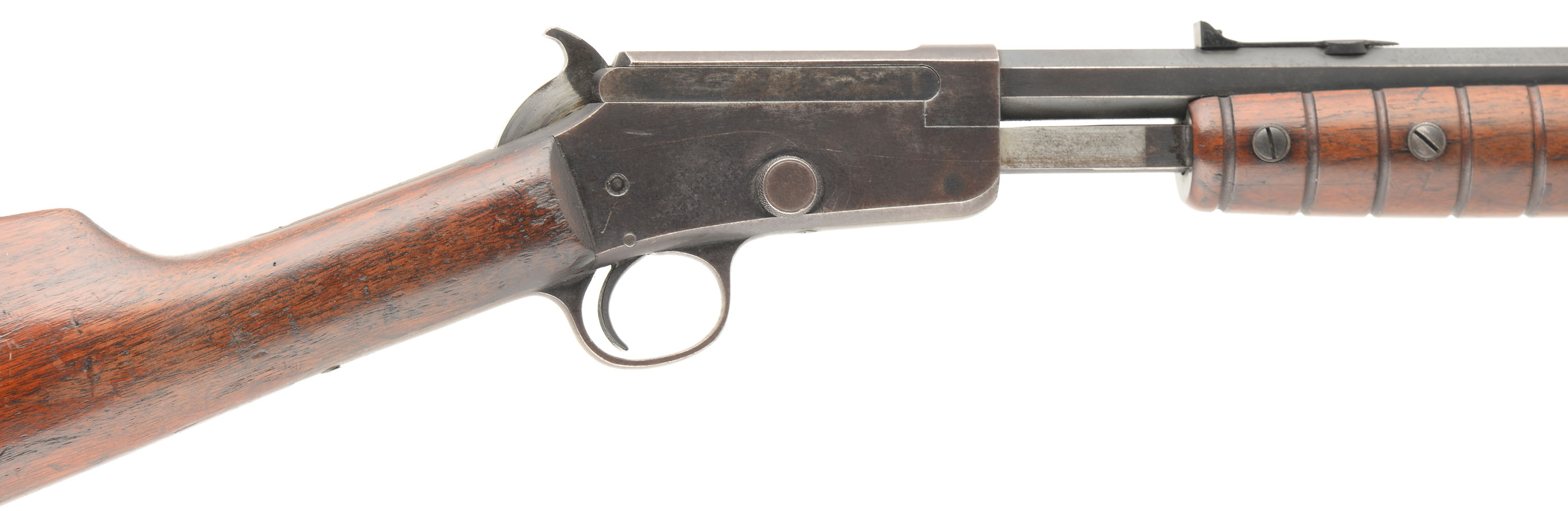 Marlin, Model 20, .22 S. L. & LR. Cal., MFG: 1906-22, SN: NVS, Pump Rifle, 22'' Octagon barrel, 2/3rd Tubular mag. Take-down. The original straight grip wood stocks are very good & solid, with numerous minor to small contusions, scratches & scrapes to the wood & original finish, which is thinning from use. The factory metal blue finish rates 70% on the barrel, while the receiver & mag tube have good coverage of an even brown patina. Barrel is mounted with an adjustable rear & blade front sights. Bore is good, with some cleaned pitting & roughness amongst solid rifling. The stock carries the original smooth curved metal buttplate. Rifle action function smooth & properly. A nice looking original example. FFL or C&R Req. - Value: 300 to 600