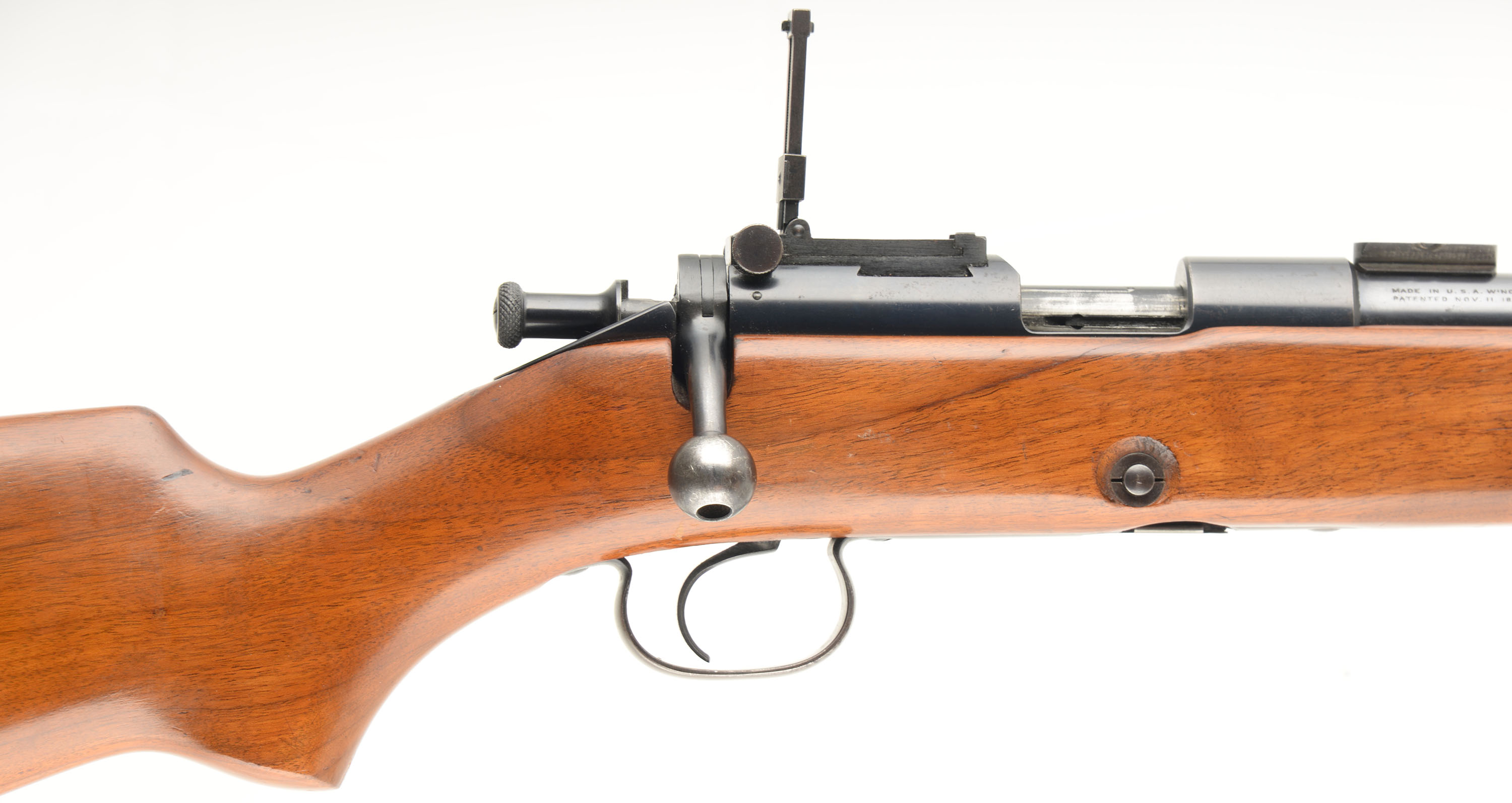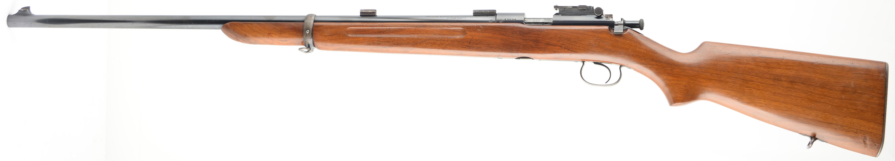 Winchester Model 52, CAL: 22 LONG R., MFG: 1927, SN: 13694, Bolt Action Rifle, 28'' barrel. The original target/military style & flat pistol grip wood is excellent. It has the finger grooved forend, with the military style barrel band. There are some minor scrapes, scratches & contusions to the orginal finish. The original metal blue finish rates 85% overall, but with additional wear on the trigger guard & floorplate. Bore is excellent. The rifle comes fitted with a multi adjusting receiver mounted ladder sight in the factory dovetail & raised front blade sight. The barrel has two blocks for scope mounting. Buttstock carries the original checkered metal buttplate & sling loops. Original ''Winchester'' marked detachable mag. An excellent target rifle. FFL or C&R Req. - Value: 600 to 1200