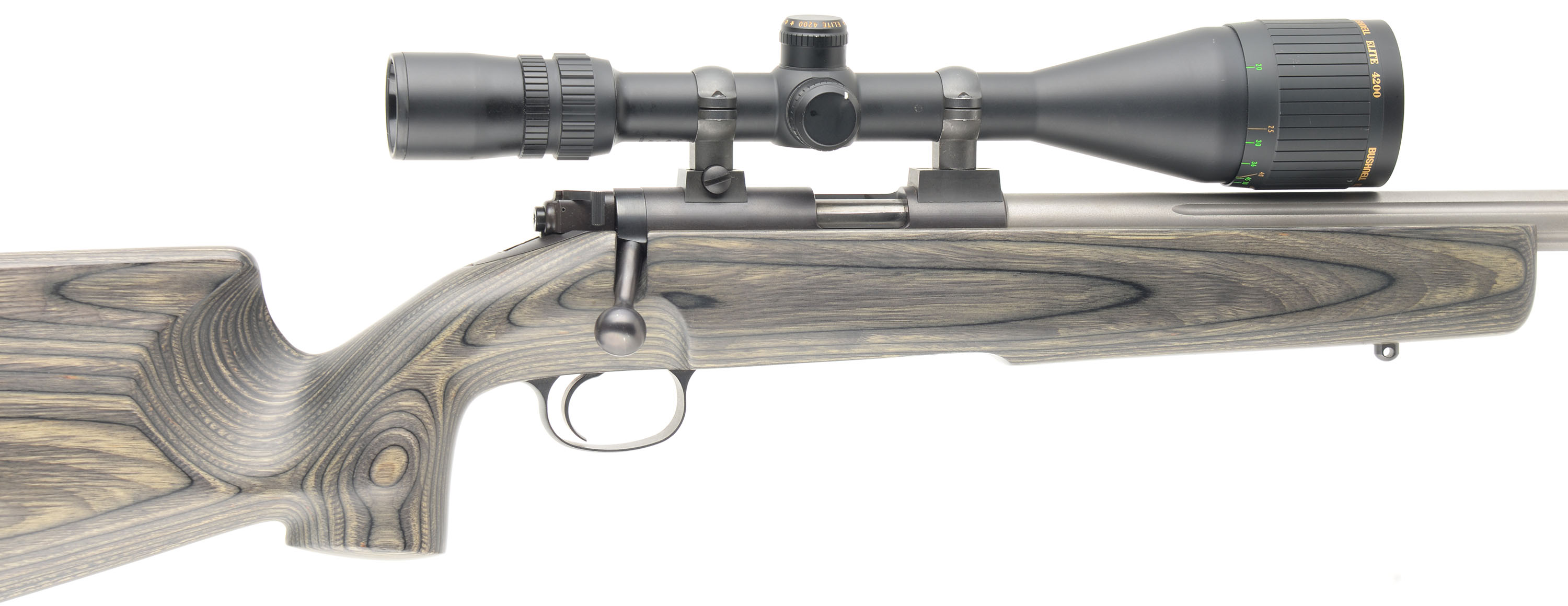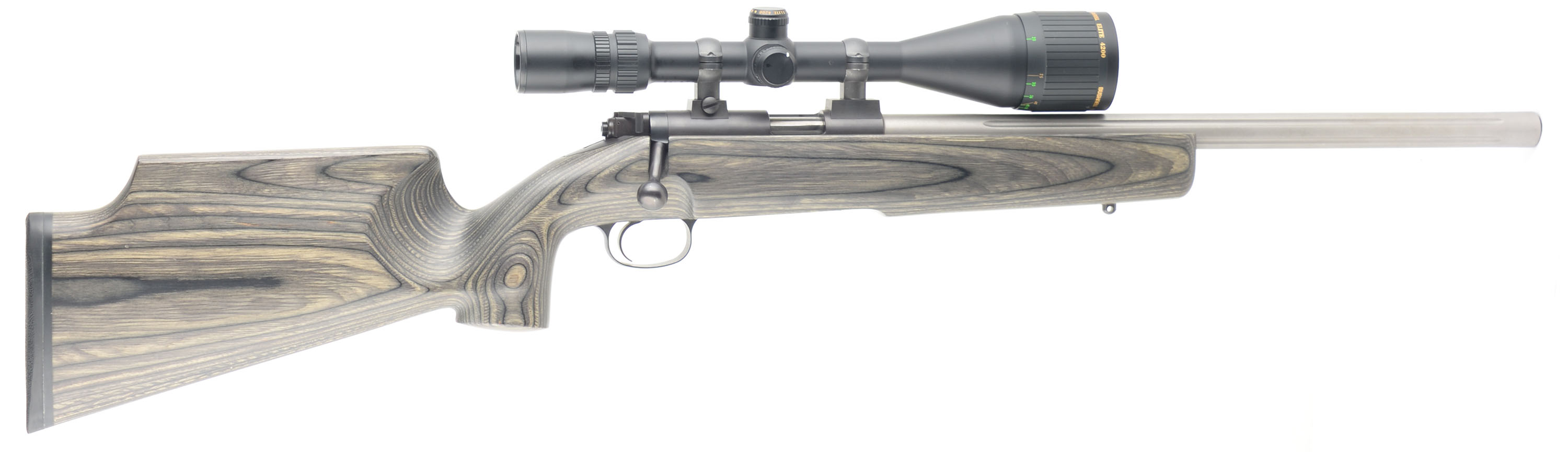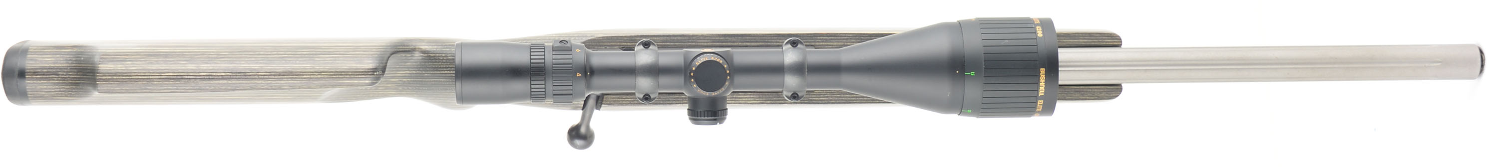 Kimber, Model 22 SVT (Short Varmint/Target), CAL: .22 LR, MFG: Modern, SN: KA02416, Bolt Action Rifle, 18'' Heavy stainless steel fluted bull barrel. The left side of the receiver is marked ''Kimber 22''. The left side of the barrel is marked ''KIMBER MFG. INC. YONKERS, NY. USA 22 LR SVT''. The original flat pistol grip & high comb, gray laminated wood stock is excellent, with excellent original finish. The original metal finishes on the barrel & receiver are excellent, rating 99%+. Bore is excellent. The receiver carries a Bushnell Elite 4200 on integrated scope blocks, while the barrel has no open sight provisions. Stock carries a Kimber solid recoil pad. The LOP measures 13.75''. Detachable ''Kimber 22'' marked 5 rd magazine. Sling stud. An overall excellent & high quality Varmint/Target rifle. FFL Req. - Value: 800 to 1200