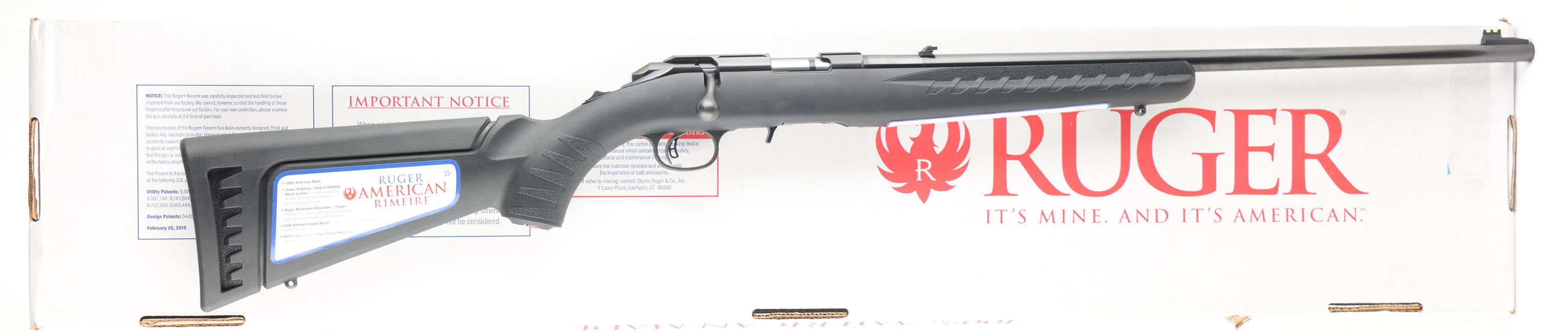 BOXED & NEW Ruger, Model American, CAL: 22 LR., MFG: Modern, SN: 833-44090, Bolt Action Rifle, 22'' barrel. The original Ruger logo capped pistol grip synthetic stock is mint, with 2 interchangeable stock modules to offer comb height options. The original metal blue finish rates 100% overall. Bore is mint. The barrel carries a folding leaf rear & factory fiber optic blade front sights. Buttstock carries a Ruger logo plastic buttend. Sling studs. Factory detachable mag. Factory retail stickers remain on buttstock & belly of forend. Comes in the original box, with extra Monte Carlo style stock piece, lock & paperwork. Basically, new in box. FFL Req. - Value: 300 to 400