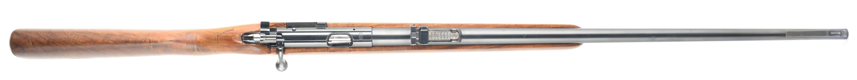 Mauser-Werke AG Oberndorf, Model: ES340B Meister Schaft Target Rifle (Championship), Cal: .22 LR, MFG: 1930's, S/N: 188269, Bolt action rifle, 26 3/4'' barrel. The original semi-pistol grip wood stock is excellent, with numerous minor scratches, scrapes & light contusions to the finish. There is a ''Mauser'' cartouche stamped on the right side stock. Lovely rippled grain displayed on the stock. The metal blue finish rates 85% overall. The bore is excellent & bright. The barrel holds the original slide adjusting rear range sight made similar to the K98K sights & a ramped blade front sight. The stock carries the original Mauser stamped metal buttplate. Sling loops. FFL or C&R Req - Value: 300 to 600