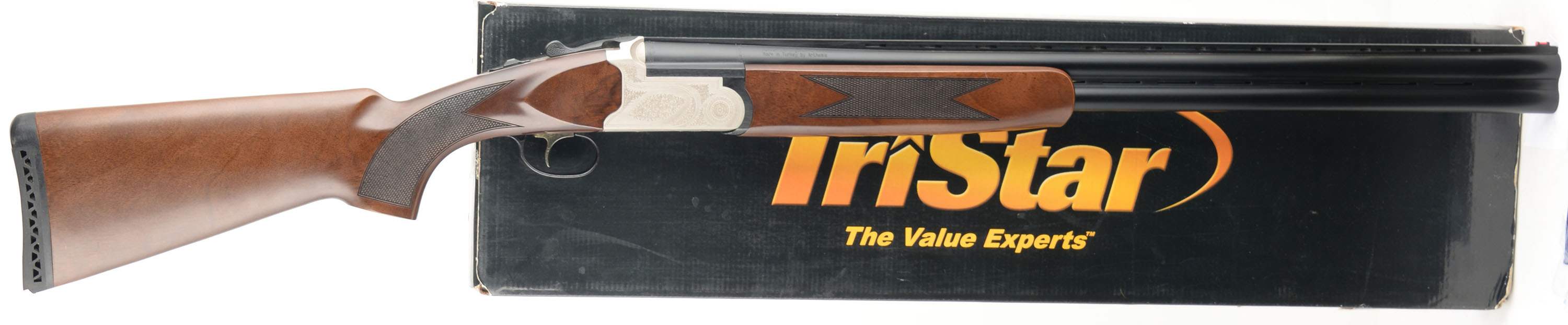 BOXED, Tristar, Hunter Ex, CAL; 12GA, MFG: Modern, SN: AR12008008, Break Action O/U Shotgun, Choke: IM/IM, 3'' Chamber, 26'' barrels. Standard factory markings., The original checkered flat pistol grip wood stock is excellent. The original metal blue finish on the barrel rates 99% overall. The lase engraved coin silver receiver is excellent. Bores are mint. The solid, matted rib holds a red fiber optic rail front sight. Stock has a ventilated black rubber recoil pad with a small missing piece at the toe. Mechanically excellent. Comes in factory box. FFL Req. - Value: 300 to 500