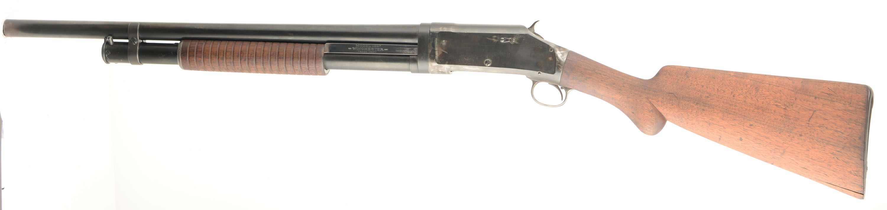 Winchester, Model 1897 Take-Down, CAL: 12 GA, MFG: 1904, SN: 268266, Pump Action Shotgun, Choke: Marked Full, Now CYL, 2 3/4'', 20 3/4'' cut down barrel. The original round pistol grip stock & corncob forend are good & solid, however there are two 3'' cracks at the toe. The original finish has worn away, with added oils. There are minor to small scrapes, scratches & contusions to the wood & finish. The metal black refinish rates 70% overall, but with cleaned rust pitting below the finish on all surfaces. Bore is good. Barrel holds no front bead. Stock carries the original checkered widow's peak metal buttplate. LOP 13 3/4''. FFL or C&R Req. - Value: 200 to 400