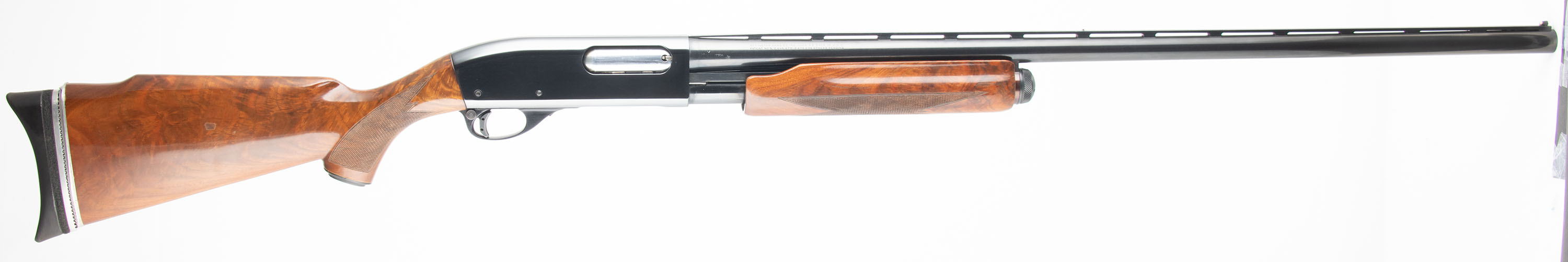 Remington, Model 870TC Wingmaster, CAL: 12GA, MFG: 1968, SN: 1163419V, Pump Action Shotgun, Choke: Marked Full (Measures Imp Mod), 2 3/4'' Or Shorter, 30'' Ventilated rib barrel. The original checkered & capped pistol grip deluxe wood stocks are excellent, with very few shallow dings, scratches & light wear to the excellent original finish. The original metal blue finish on the receiver & barrel rates 99%, with a bit more wear to the magazine tube. Bore is excellent. The serrated ventilated rib holds mid rib & front bead. The stock carries a Morgan Adjustable Recoil Pad Co. curved recoil pad. LOP is 14 3/4'' over pad. Mechanically excellent. FFL or C&R Req. - Value: 1000 to 1500