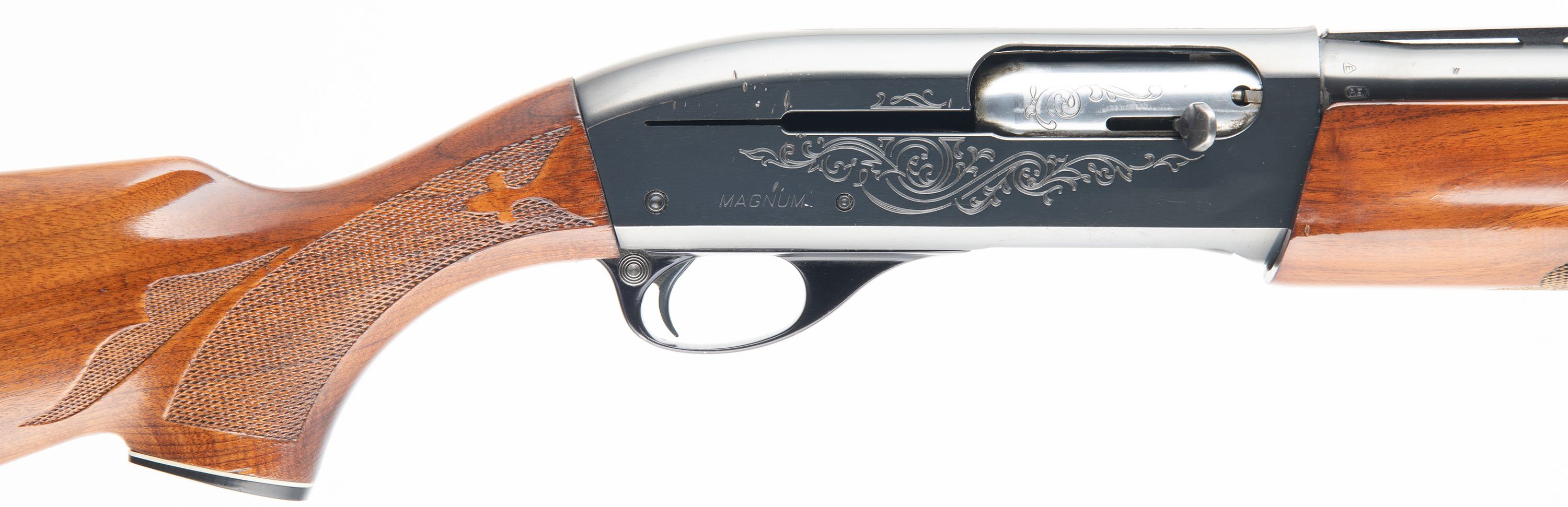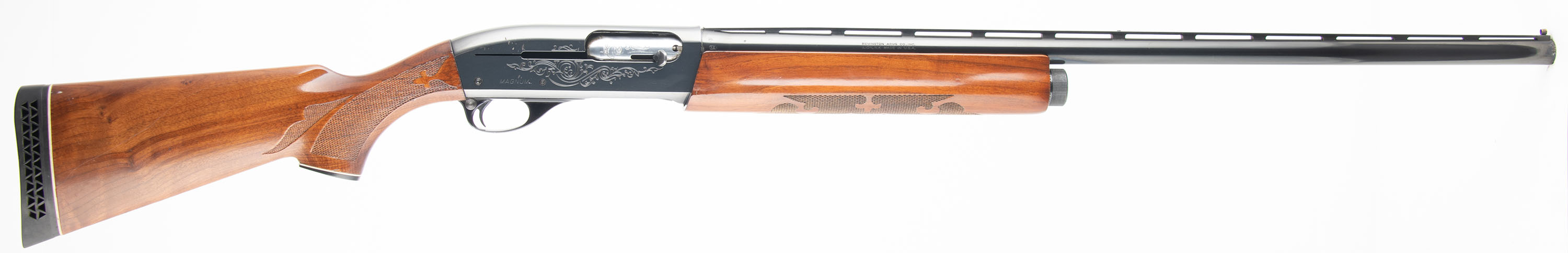 Remington, Model 1100 Magnum, CAL: 12GA, MFG: 1968?, SN: L795583M, Semi Auto Shotgun, Choke: MOD, 2 3/4'' Chamber, 27 3/4'' standard barrel. Standard factory markings on the barrel & receiver. The original press checkered, capped pistol grip stocks are excellent. There are only minor handling marks to the finish. The metal blue finish on the replaced barrel rates 97% & the receiver rates 90%. Bore is excellent, with intermittent spots of roughness. The ventilated rib holds a flattened mid rib bead & fiber optic front bead. Stock has a ventilated recoil pad. The receiver is rated for 3'' magnum loads, but the replaced barrel is for standard 2 3/4'' loads ONLY. FFL or C&R Req. - Value: 400 to 800