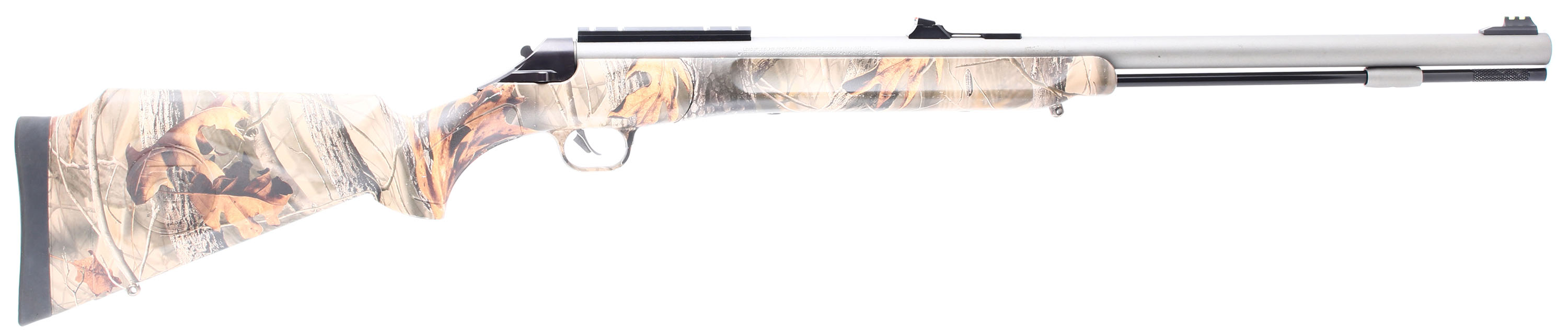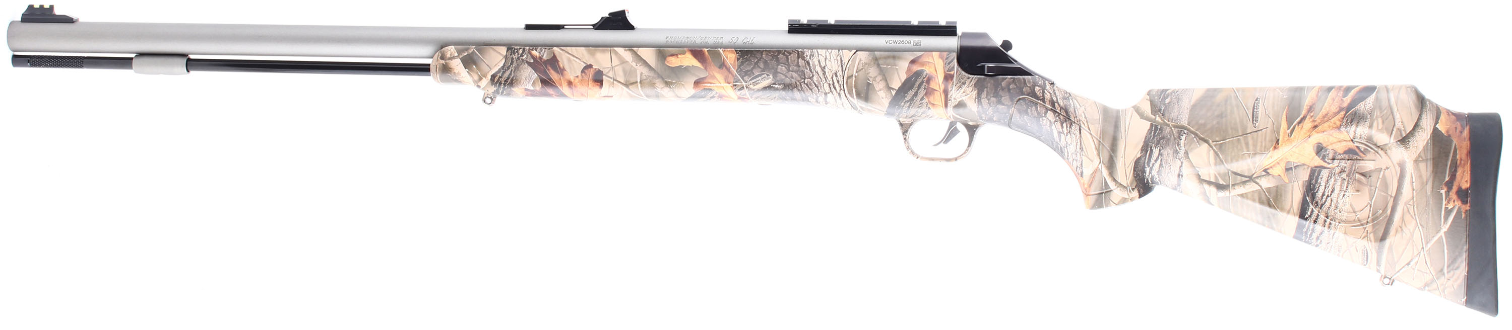 Thompson Center Arms, T/C Impact, CAL: 50, MFG: Modern, SN: VCW2608, Percussion Muzzleloader Rifle, 26'' barrel. The synthetic & ergonomic Monte Carlo stock is excellent. The REALTREE Hardwood camo finish is excellent, with minor handling marks & chips. The satin stainless finish on the barrel is very good, with handling marks & the pull back action rates 95%, toning plum. Bore is excellent. Fiber optic sights. Integral sling studs. Ramrod present. Missing screw-in breech plug. Mechanical operation appears to function properly. Muzzleloader, No FFL Req. - Value: 150 to 300