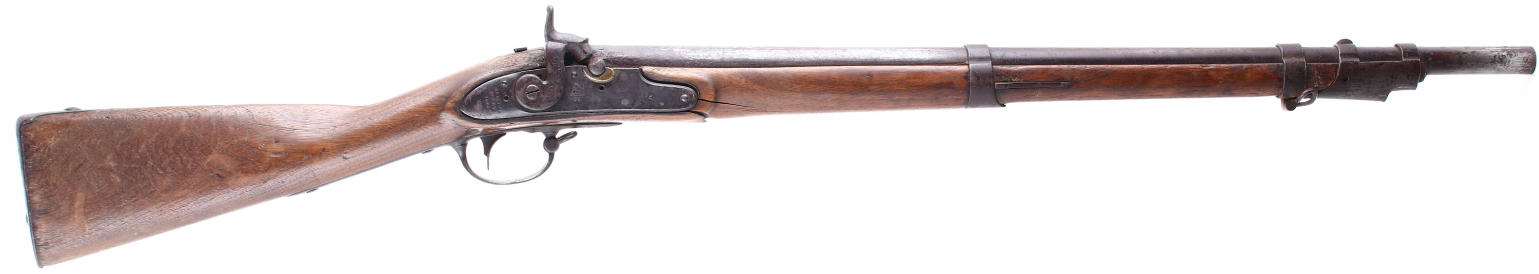 HISTORY: The M1822 Musket was a continuation of the M1816 musket, sometimes referred to as the M1816 type II, or sometimes still referred to as the M1816 in older documents. The Biggest change from the M1816 is the attachment of the rear sling swivel, now attached to the trigger guard & not a stud on the trigger guard tang. Lots of these rifles would be converted to percussion & rifles by both the military & by civilians after they were surplused. Converted M1822 & original smoothbore flintlocks were used on both sides of the civil war, mainly during the beginning when percussion rifles were in short supply. Most of these would stay as smoothbore because most of the barrels were too thin to be bored with rifling & still be strong enough to contain the blast. The later M1840, still a smoothbore flintlock, was made with thicker barrel in anticipation of rifling them later, these were the majority of the smoothbores that were converted to rifles. After the civil war the Government was quick to sell off their obsolete muzzleloaders & begin upgrading them with metallic cartridge breechloaders, flooding the market with cheap surplus guns. Many were bought up cheap & converted to fit the use of the owner. This musket has a after marked replaced hammer & been cutdown into a short rifle with the military hardware moved back on the stock.