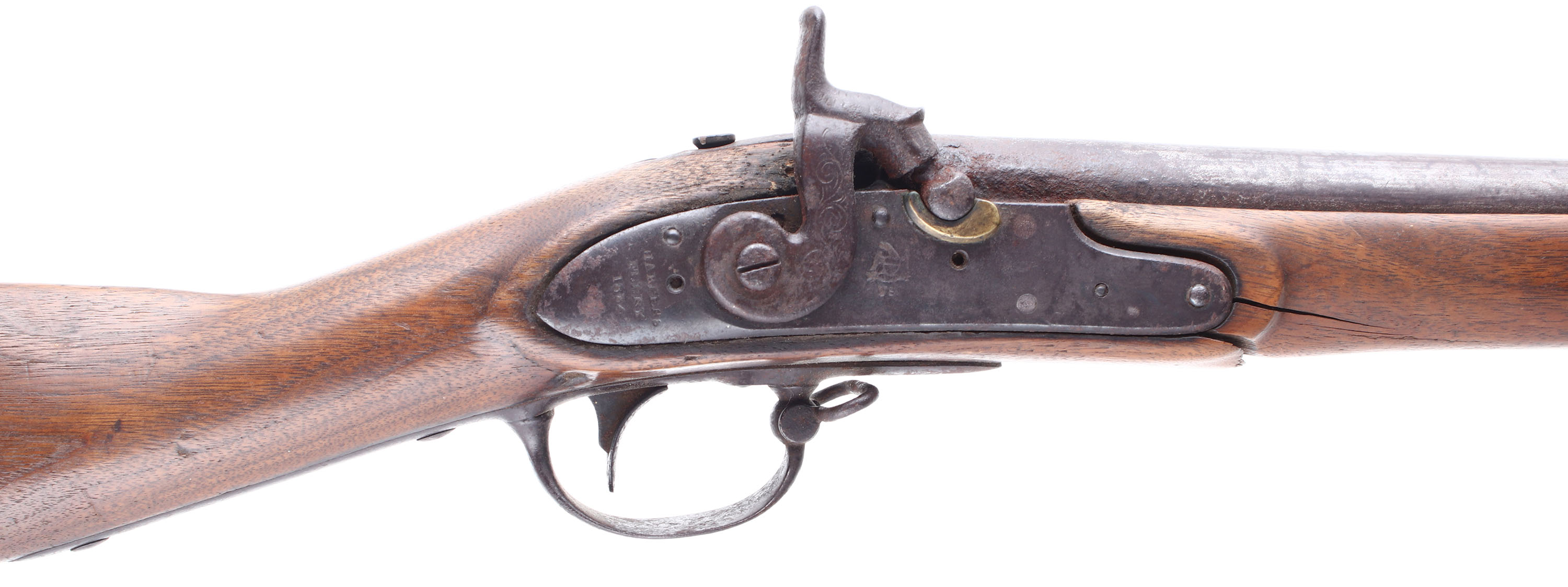 CONDITION: The straight wrist wood stock is poor, has a complete stock break through the bottom of the stock, just at the forward tip of the lock plate. Metal is proud to the wood around the buttplate from wood shrinkage/wear. Small hole in the bottom of the right stock flat, between the trigger & rear tip of lock plate. chunk of stock missing at the top of the wrist to the right of the barrel tang. No visible cartouches on the stock. The metal has toned to a brown patina with some roughness across the metal, mainly concentrated at the rear of the barrel by the nipple. Most markings are faded from wear/rust. The left side of the barrel marked ''V'' over ''P'' over a eagle's head. The barrel tang is marked ''1834''. The lock plate is marked ''HARPERS'' over ''FERRY'' over ''1834'', & a American great eagle. The replaced aftermarket hammer has ornamental engraving. The bore fair. Slightly bright, has roughness & light pitting. The front barrel band holds a brass front sight. The stock carries a iron buttplate, toned brown with roughness. It has both sling loops but is missing a ramrod. Hammer does not function properly, hammer does not cock back. A old military musket that shows her hard use after the war on the American frontier. Antique/Muzzleloader, No FFL Req. - Value: 200 to 400
