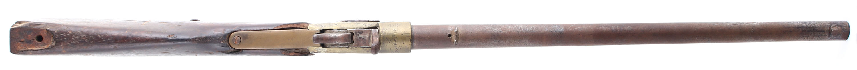 CONDITION: The straight wrist buttstock is fair to poor. Has cracks, chips, scratches, vice marks, dings, & wear from use/age. Missing forend. The barrel has toned to a mixture of gun metal gray & brown patina. the Brass frame has patina & numerus nick & ding marks. Crack in the rear top screw hole on the right side of the receiver along the top of the frame. Frame missing the forward receiver tang. Breech block is stuck forward, does have some play but wont mechanically open. Hammer is seized, does have some play but wont lock back. Forend/barrel lug is loose. The receiver band is marked ''N.L.P.''. The bore is Poor. Dark with pitting. The barrel holds a barleycorn front sight with a fixed U-notch rear. Buttstock has no buttplate. The rifle has a rear sling mount, loop is bent. This rifle is being sold AS IS with NO RETURNES ACCEPTED. Antique, No FFL Req - Value: 100 to 600