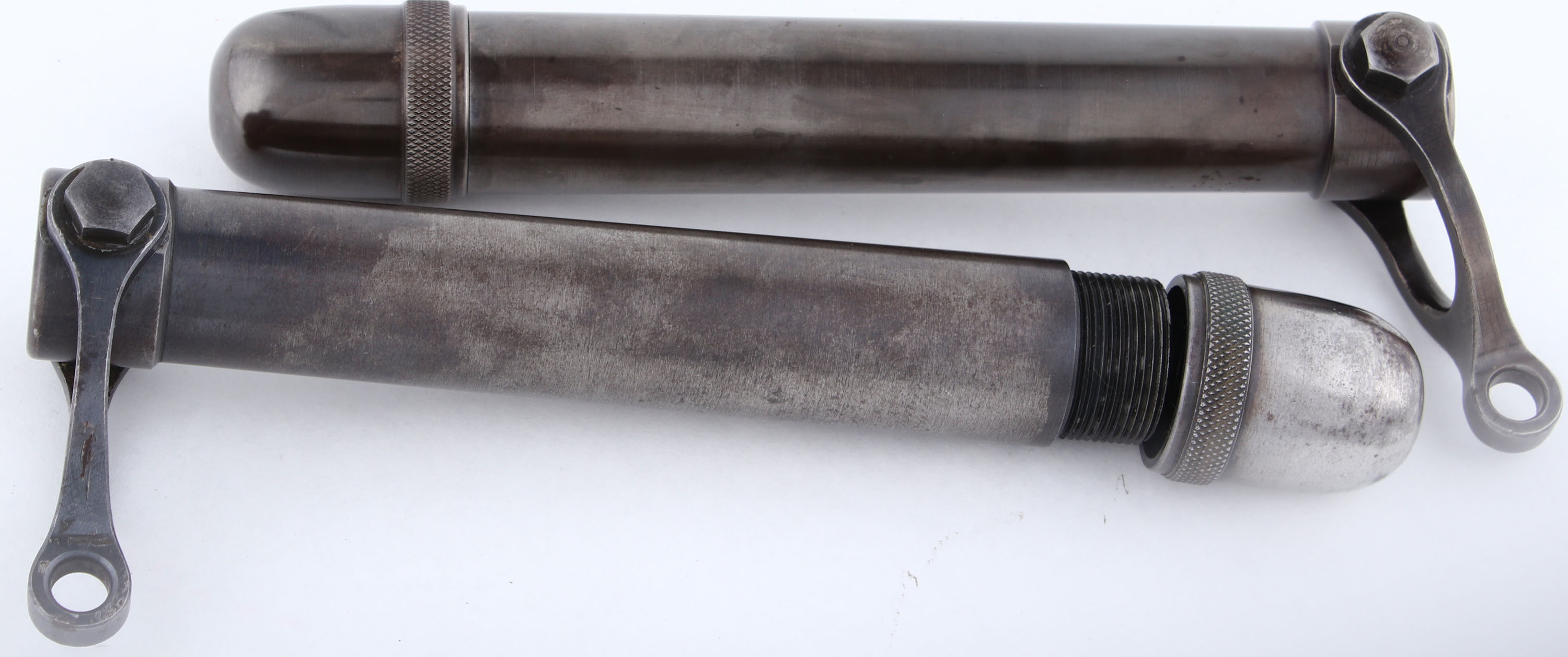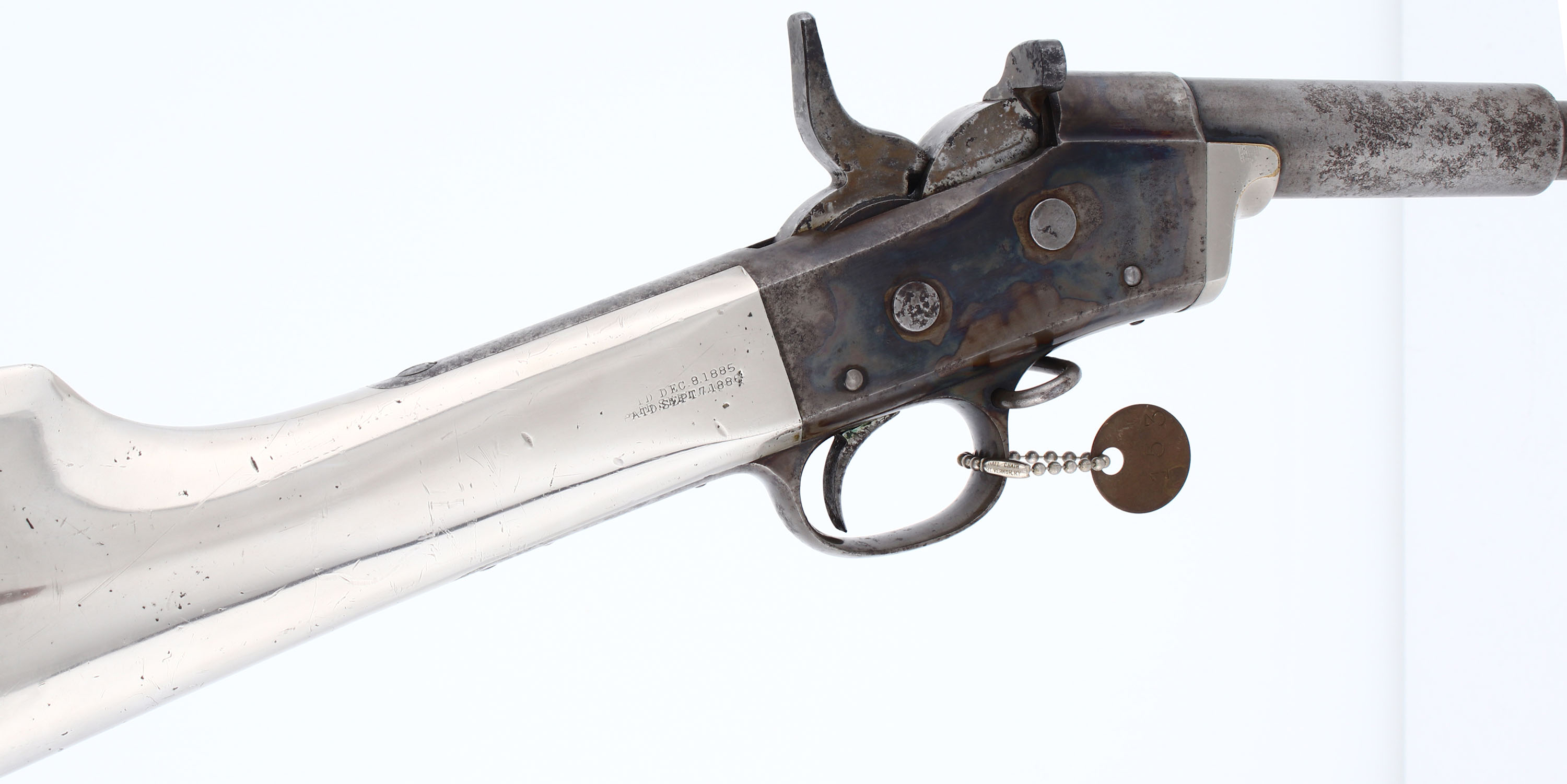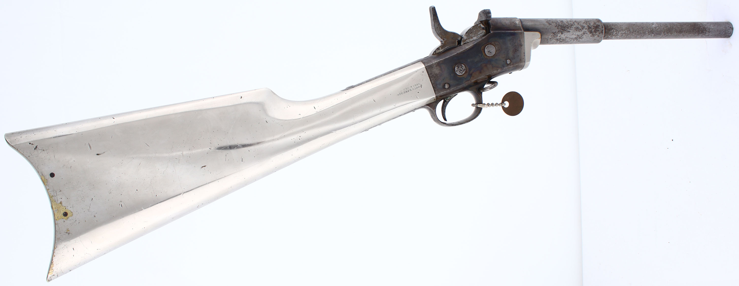 CONDITION: the straight wrist, nickel plated solid brass buttstock is very good, has some scratches & dings as well as some nickel flacking/chipping & pealing around the butt end corners & corners of the wrist. The buttstock retains about 96% of its nickel finish. The right side of the wrist is marked with the patent dates ''DEC.8.1885'', ''SEPT.7.1886''. The case-hardened finish on the receiver retains about 75% coverage with common wear spots thinned/toning to a brown patina. receiver has a light speckling of surface rust. The barrel is bare steel & has a rust/patina speckling. The left side of the receiver is marked ''REMINGTON ARMS CO. ILLION N.Y.''. The bore is very good. bright &* shiny with a couple spots of roughness. Rifle comes with two of the sleeve projectiles. Stock has no buttplate. A unique & rare collectors piece with a interesting use. Antique, No FFL Req - Value: 5000 to 10000
