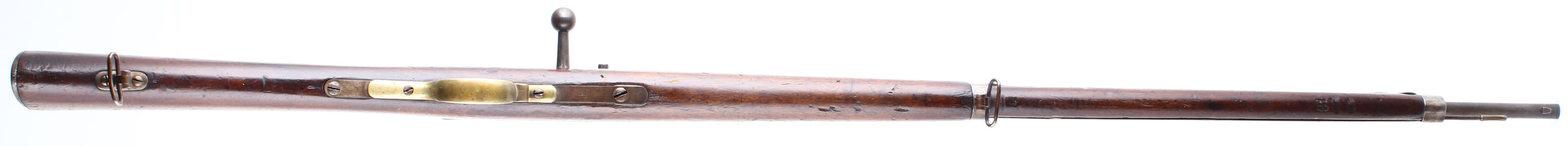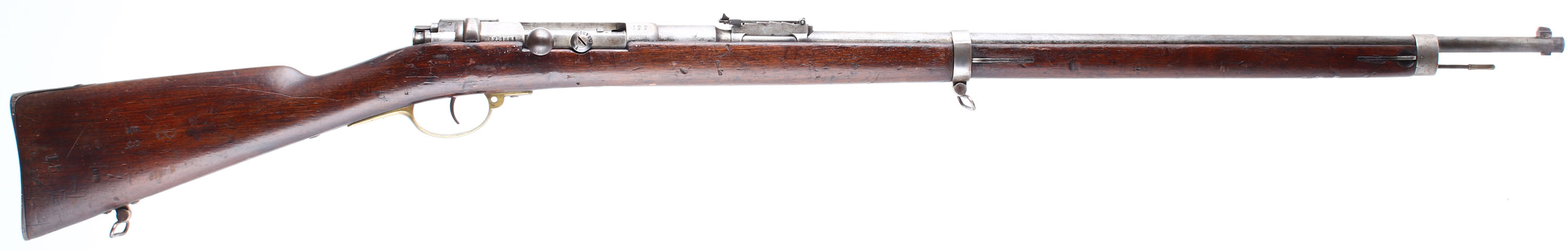 CONDITION: The straight wrist wood stock is good with numerus small nicks, dings, dents, & scratches from use/age. Two 1'' cracks on the top of wrist, emanating from the receiver tang, as well as some small chips. Two small end grain cracks at the toe, one on each side. The right cheek of the stock is handed etched ''B'', & stamped ''43'', ''15''. One small cartouche on the belly of the buttstock, just in front rear sling mount. bottom of the wrist marked with a faded ''F'' over a crown on top of a ''O''. the bottom of the forend, between the barrel bands, is stamped ''13''. The metal has toned to a gun metal gray with brown patina setting in. The receiver was left in the white (unfinished) from the factory. Spots of roughness/pitting around the stock line by the chamber & receiver. Brass trigger guard. The left side of the receiver is marked with the S/N, ''I.G.Mod.71.''. Right side of the receiver is marked with three Imperial German, crown over letter proofs, ''82.1881''. Dr. Dieter Storz mentions in his book ''German Military Rifles'', that the later date stamp is when it was issued to troops in German service. The top of the barrel is marked ''L.F.t.P'', ''St. Denis''. All parts S/N mismatched. The bolt body & striker body are S/N matching. The bore is excellent. Bright & shiny with little to no visible wear. The barrel holds a barleycorn front sight with a stepped base/ladder V-notch rear sight. Base marked 2 to 10, ladder marked 12 to 20. The stock carries a bare steel buttplate, has brown patina speckling. Rifle has bottom sling loop & forward sling ring. Rifle has brass tip cleaning rod. Antique, no FFL Req - Value: 600 to 1200