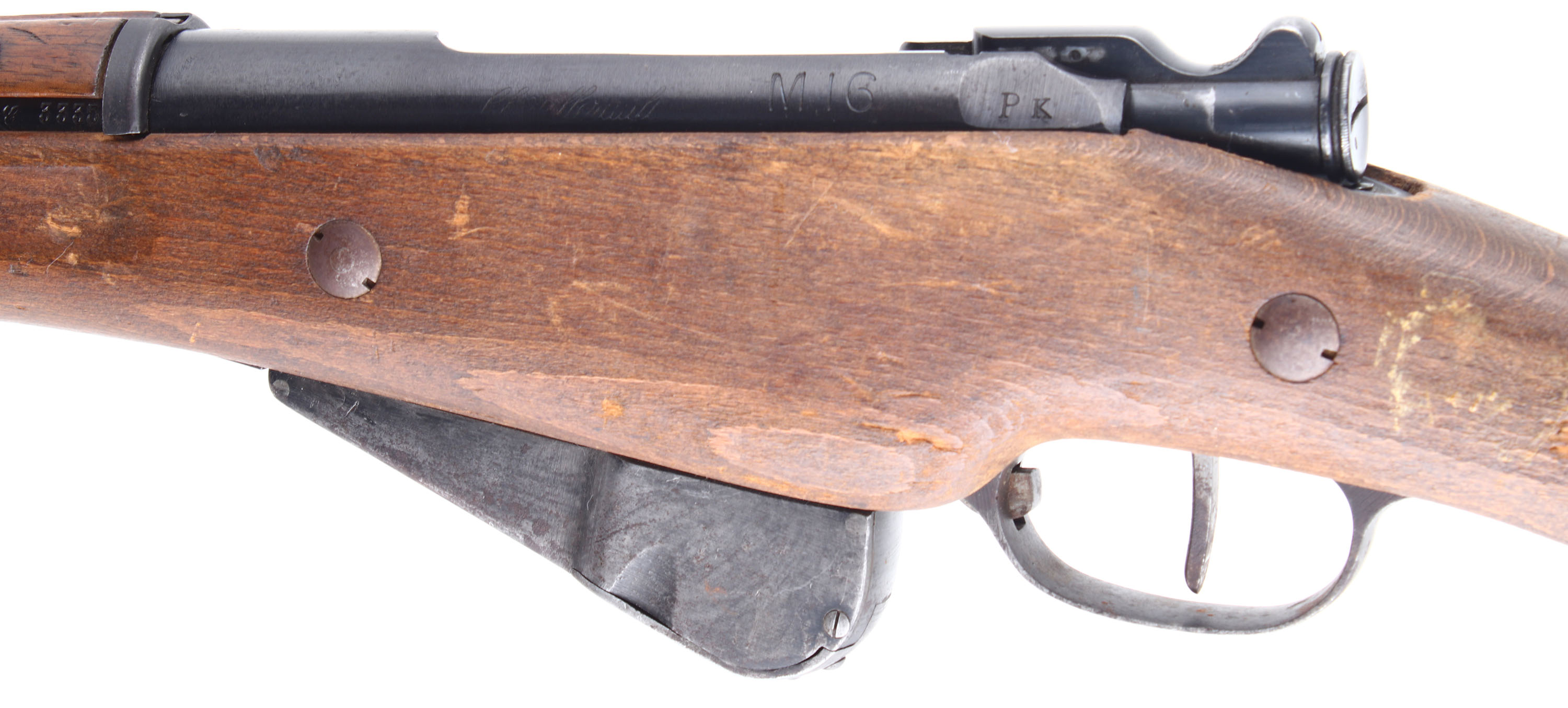 HISTORY: The Berthier was designed as a replacement for the aging single shot black powder Gras rifle that was being used by Mounted security forces, cavalry units, artillery units, & in colonial service. The French had the Lebel in the new smokeless 8mm round, but it had a tube magazine that ran the length of the barrel, therefore cutting them down created a problem with capacity. The new rifle was designed by Andre Virgile Paul Marie Berthier, a French civilian engineer in the Algerian railways. It used a three shot Mannlicher end-bloc clip, greatly increasing reload speed, particular convenience for cavalry and other mounted troops. The Lebel had to be single loaded instead of loading all at once, giving the Berthier a faster fire rate over the whole length of a battle, even though the Lebel held eight Rds., while the Berthier held three. The smaller capacity was chosen over the typical five rounds after field testing, where the cavalry expressed a preference for a non-protruding magazine that did not interfere with the balance or handling of the rifle. It was adopted on March 12, 1890 & designated the MLE 1890. The cavalry loved the carbine, & another version would be made specially for the Artillery troops which added a bayonet lug & changed the forend of the stock, this would be the MLE 1892. The MLE 1892 would be made clear to 1917, until production of its upgrade the MLE 1916 could start in May of 1917. The MLE 1916 added a five shot magazine & a handguard from the many complaints of use with front line troops. Production of both the 1890 calvary & 1892 Artillery would stop & the MLE 1916 Mousqueton would replace both. Older models would also be updated with the newer parts once they got sent back to a arsenal for repair, leading to rifles with a mix of parts & markings. The MLE 1892/M16 carbines were the only model of Berthier produced after WW1 with all other being discontinued, it would made till 1938. This gun is Ball N marked. This means it was modified to use the new Ball N cartridge. This new cartridge was tailored to long range, heavy machine guns having a heavier bullet & more powder. This results in more chamber pressure & the chambers of older rifles had to be modified to safely fire this new cartridge. The cartridge was developed in 1932 & all older weapons still French inventory from 1934 to 1939 were modified to the ball N chamber & marked ''N'' on the barrel or receiver. Firing Ball N ammo out of a non ''N'' marked gun is unsafe & shouldn't be done. A ball N marked gun is safe to fire N & Non-N 8mm Lebel out of.