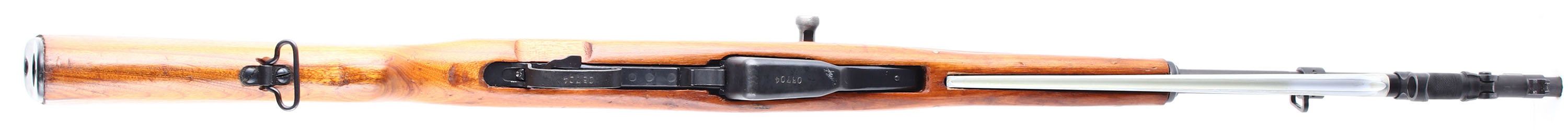 CONDITION: The semi-pistol grip wood stock is excellent with a couple small cosmetic nicks & dings. Left cheek of stock marked ''0570'' & a rectangle with a diagonal line. The blued metal finish on the barrel rates 90% with areas of thinning & spots starting to tone brown. The blued metal finish on the receiver rates 90% with spots of scratches & thinning. Left side of the receiver is marked with the S/N, the factory 0306 triangle logo, & import markings. The rear of the barrel has a couple proof marks. S/N matching magazine, trigger guard, bolt, & bolt carrier. The bore is excellent. Its bright & mirrorlike with little to no visible wear. Chrome lined bore. Post front sight with protective globe, Tangent U-notch rear sight with a battle zero mark & 1 to 10 markings. The blue steel trapdoor buttplate, has a cleaning kit inside. No cleaning rod. Affixed folding cruciform bayonet. Rifle has both sling loops. A beautiful example of a scarce Type 56 SKS manufacturer. FFL or C&R Req. - Value: 400 to 800