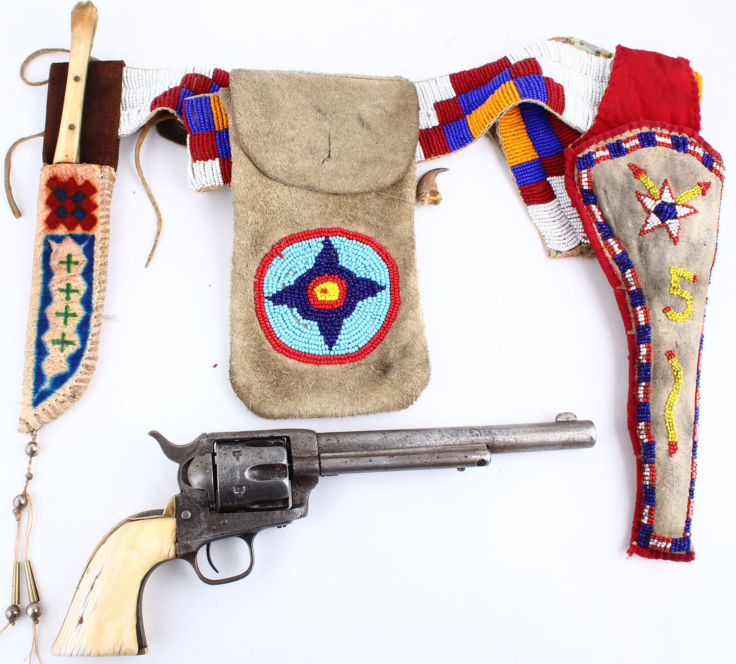 CONDITION: The authentic ivory grips are very good & solid. The grain pattern & difference in tones are appealing. There are some minor edge chips. The original nickel finish has fully worn to gun metal gray, with remnants of original nickel finish remaining on the cylinder, in protected areas. The bottom of the barrel, just in front of the cylinder pin is marked ''44'', no other visible barrel markings. The patent stampings on the left side of the frame is worn but still partially visible. There is spotting & pitting throughout the metal surfaces & a barrel ring 2 3/4'' from the muzzle. The bore is poor, dark & worn. Integral v-notch rear sight & blade front sight. Mechanical operation appears to function properly, but the action has play & the components appear to be worn from use. The normal four cylinder clicks are reduced to two. This revolver is accompanied by an 1880's beaded belt, with white, red, yellow & blue beads. The belt holds a beaded holster, beaded pouch, painted knife sheath & a small metal badge marked ''DEPT OF PUBLIC SAFETY TEXAS RANGERS'' with a Texas Star in the middle. The beaded holster has a Texas Star with arrows, ''5'' & a snake?. The knife sheath holds a 6'' blade, with bone handle. Blade condition is fair. A unique set, with accoutrements. The frontier Six shooter came out in 1877 in .44-40 rather than .45 Colt. This was done to have ammo interchangeability with the popular 1873 Winchester to boost sales. This pistol has a black powder frame which uses a set screw to lock the cylinder pin & not a push button. It was introduced in 1892, but was not fully implemented until 1896 with old frames & parts being used up. Antique, No FFL Req - Value: 2500 to 4500